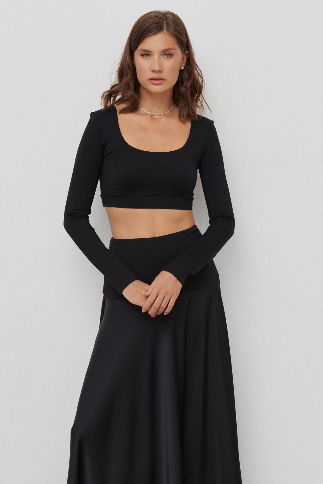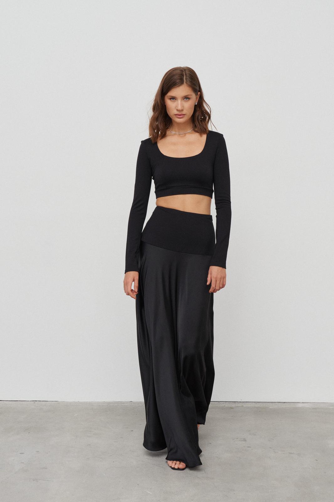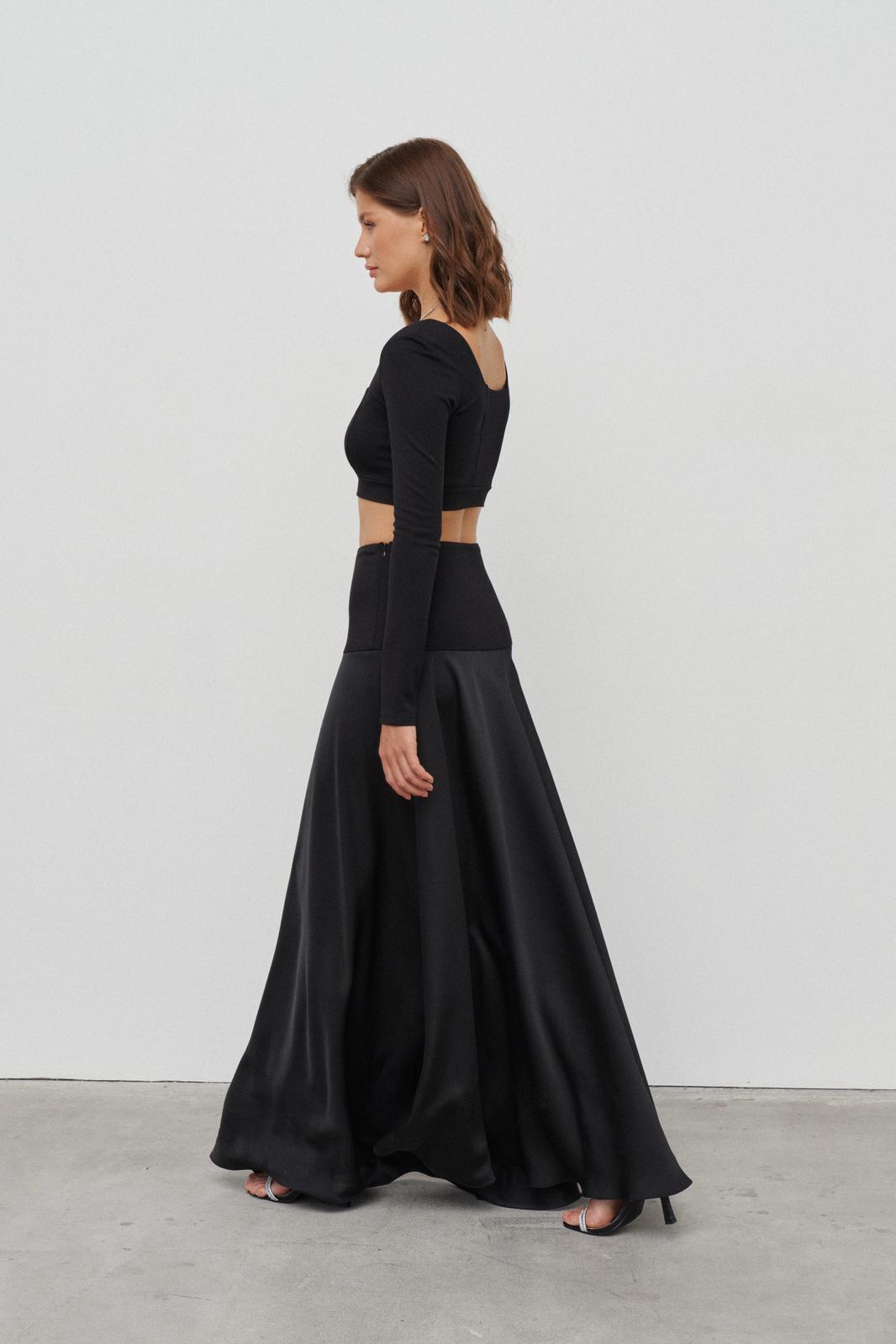 Комплект состоящий из топа и юбки-макси. Топ из трикотажного полотна прилегающего силуэта с длинным рукавом и вырезом каре спереди и сзади. Юбка из атласной ткани с кокеткой из трикотажного полотна. Застёжка на потайную молнию сбоку.