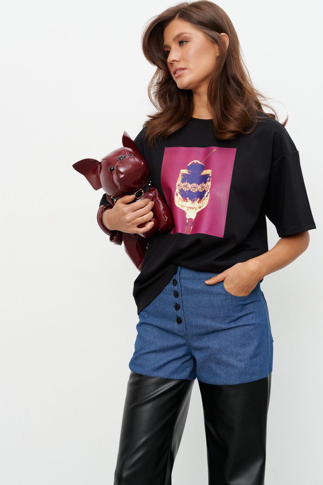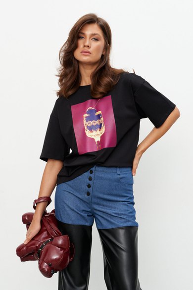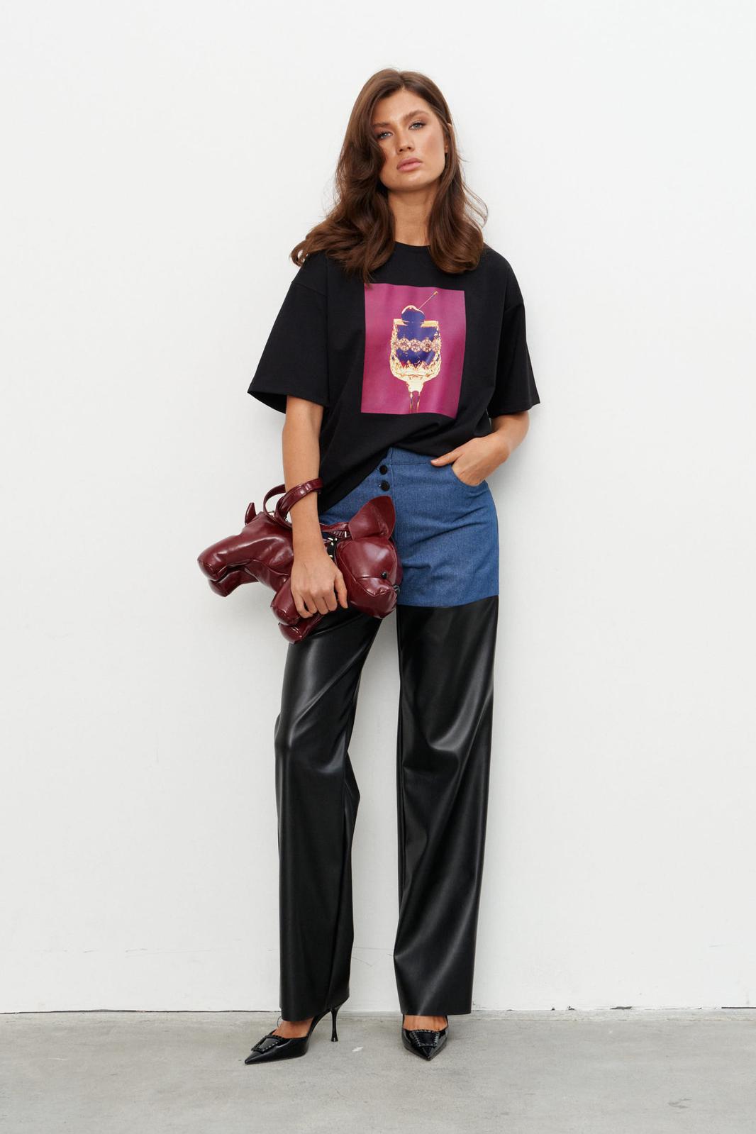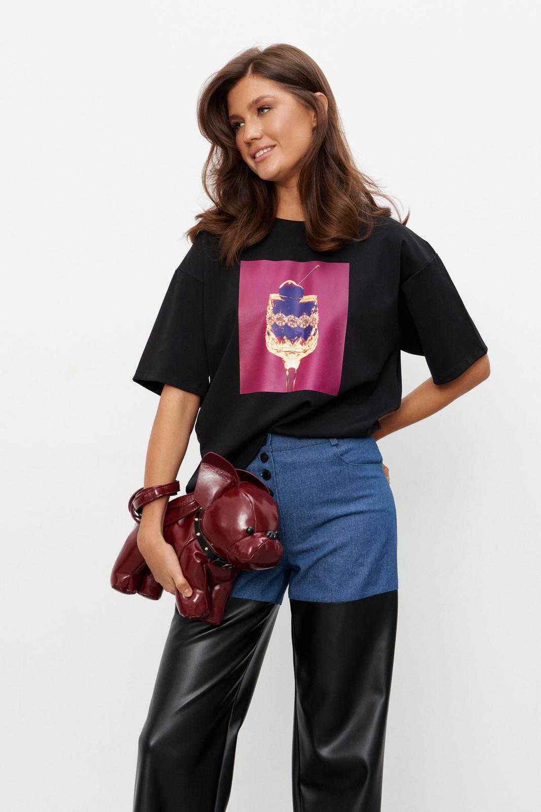 Оверсайз футболка из плотного трикотажа с ярким принтом «бокал». Линия плеча спущена, горловина отделана эластичной бейкой.