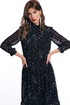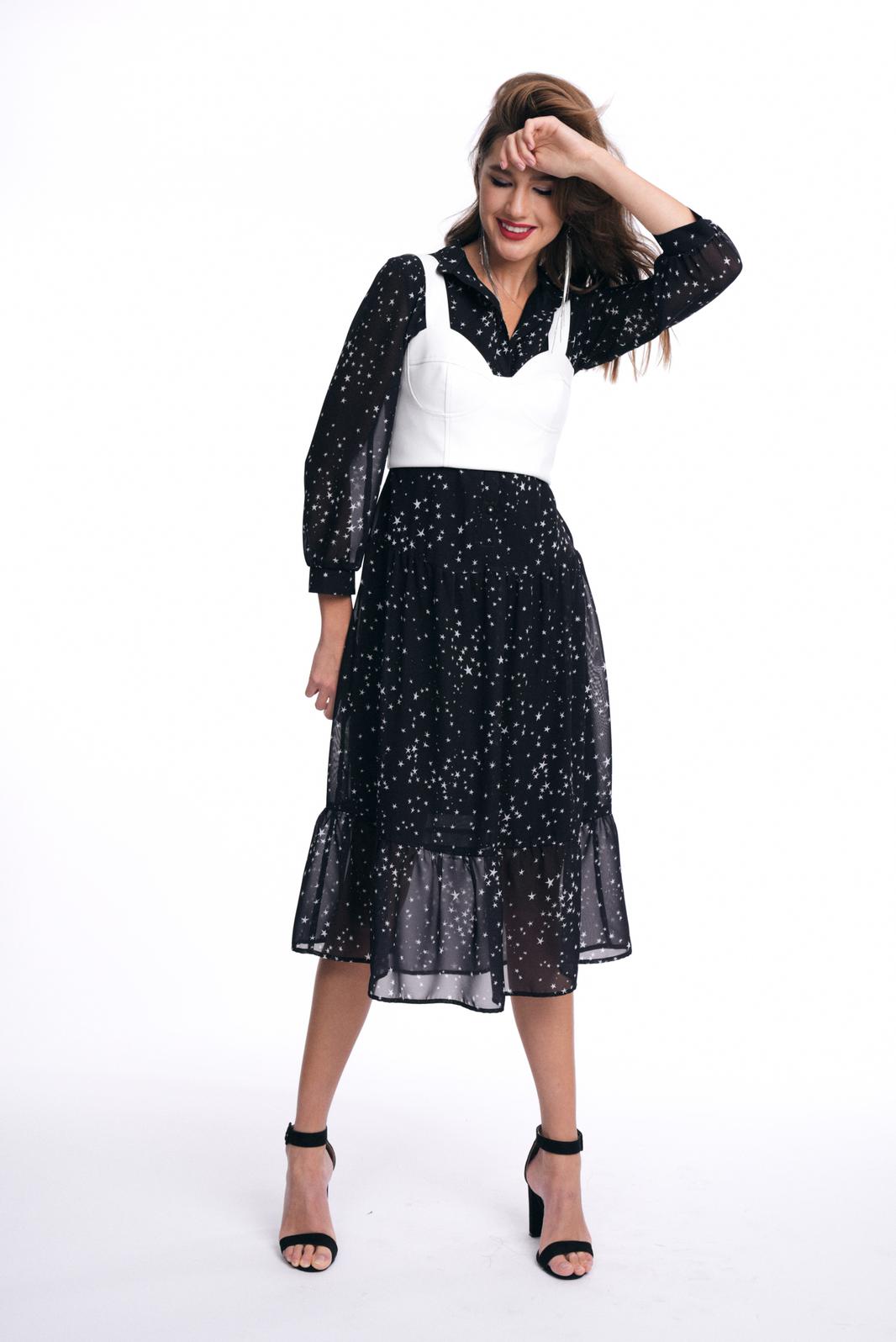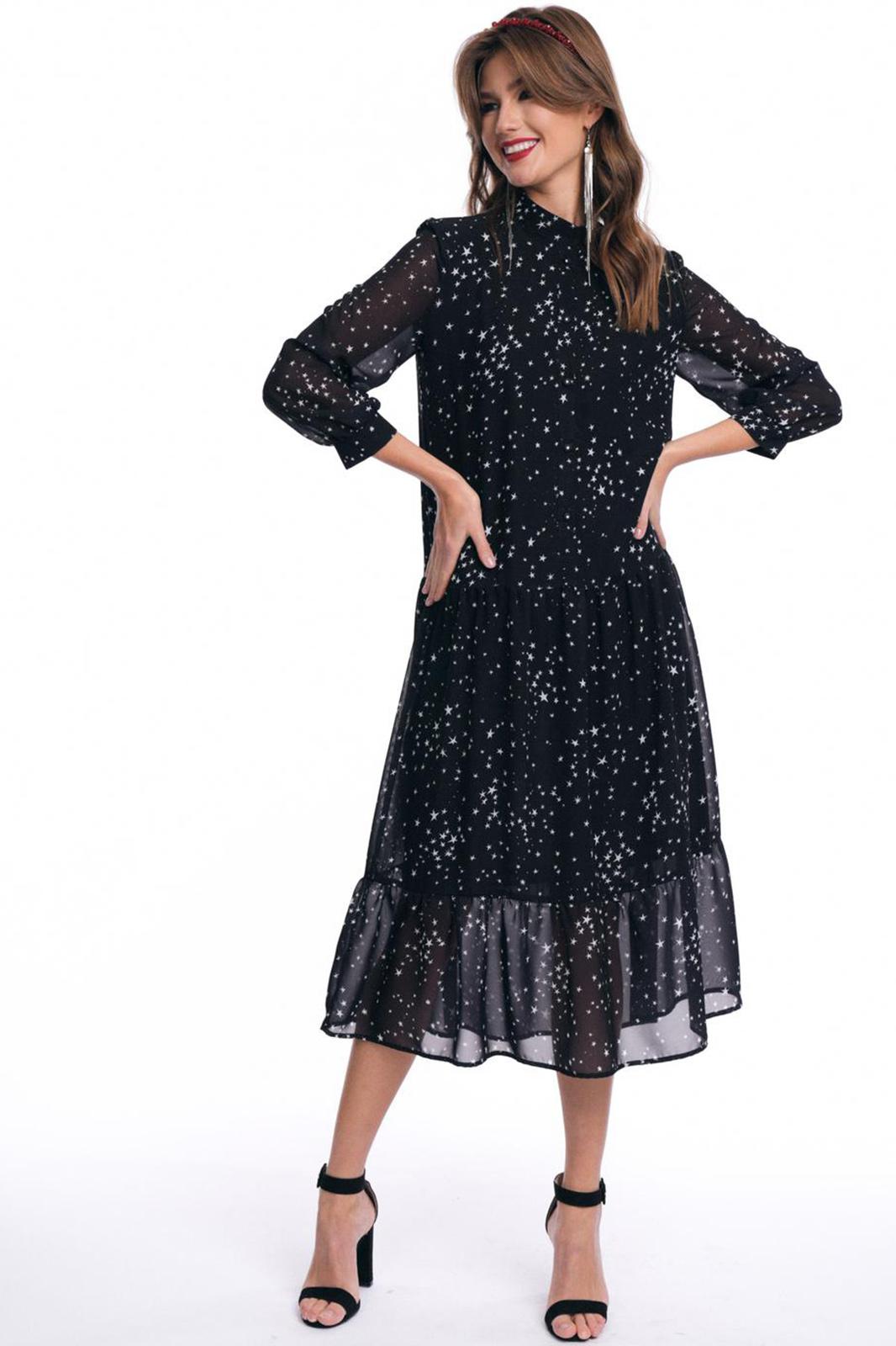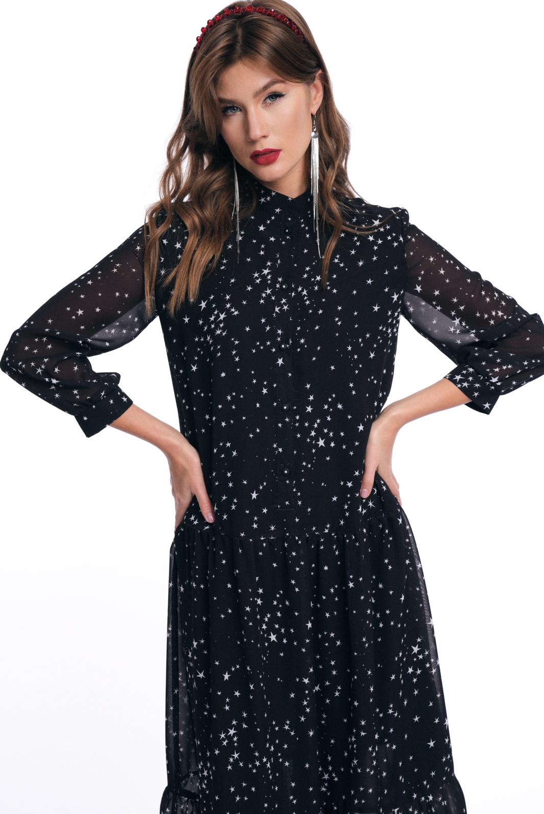 Платье свободного кроя из шифон длина миди. Верхняя часть переда с планкой которая застегивается на пуговицы. Платье с одним воланом на сборке.Воротник стойка. Рукав втачной со сборкой по низу с притачной манжетой. Платье на подкладке.