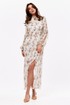 Платье женское малого объёма, прилегающего силуэта. Лиф переда с нагрудными и талиевыми вытачками. Из середины горловины до середины проймы переда проходят фигурные кокетки с притачными рюшами. Лиф спинки с талиевыми вытачками. Передняя и задняя часть юбки с талиевыми вытачками. По переду с левой стороны находится рельеф, который переходит в разрез до линии колена. Рукав втачной состоит из двух частей, которые разделяет рюша на сборке. Верхняя часть рукава малого объема выше линии локтя. Нижняя часть рукава большого объема сверху на сборке. Низ рукава с притачным манжетом на резинке. Рукав длиной до линии запястья. Воротник стойка с притачной рюшей. Застежка сбоку на потайную тесьму «молнию», а также на притачную планку по переду с прорезными петлями и пуговицами. Платье длиной макси.