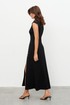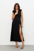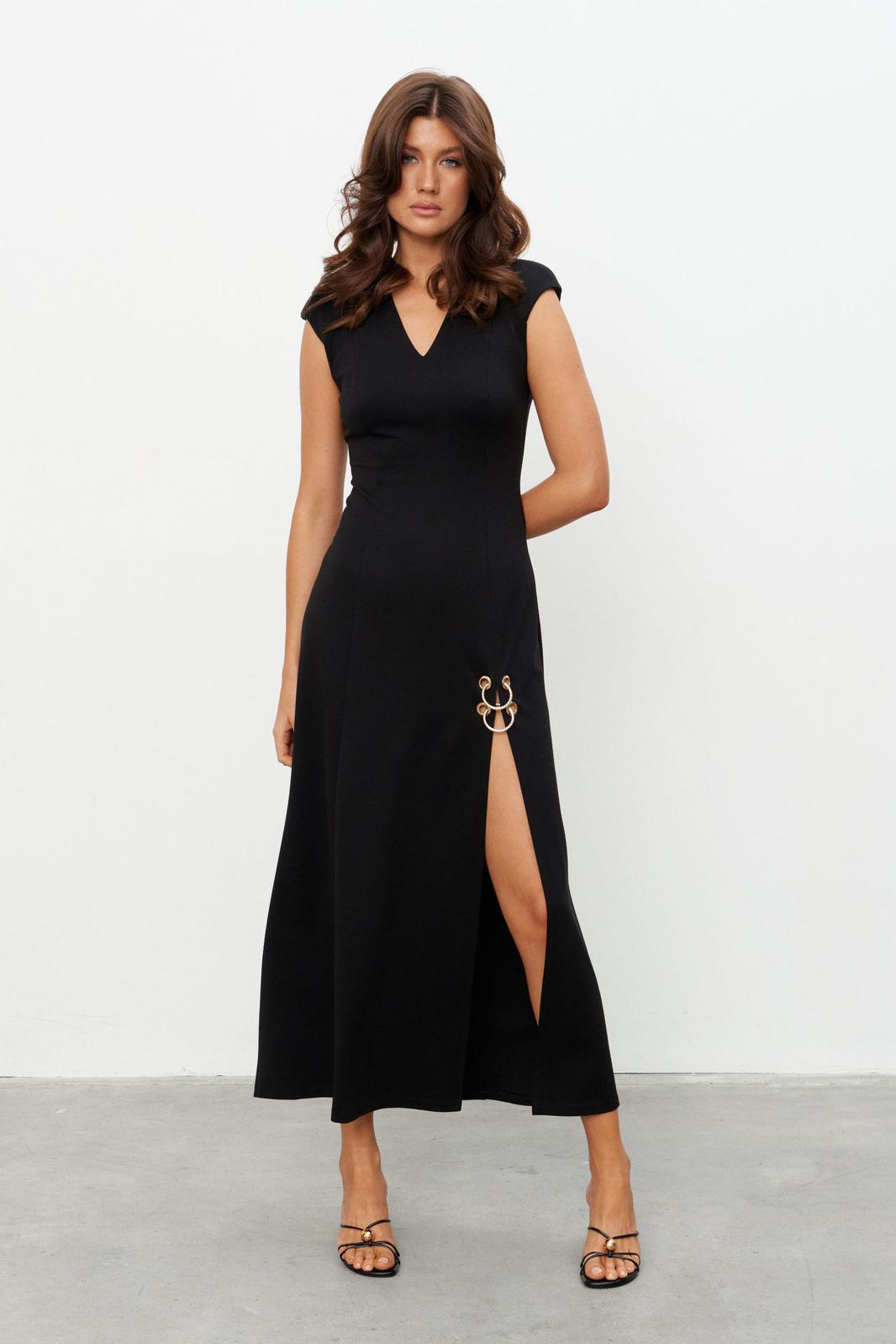 Платье из трикотажного полотна приталенного силуэта с расклешённой юбкой с высоким разрезом. Вырез горловины V-образный, По плечам - плечевые накладки. Верх разреза отделан люверсами и кольцами в качестве декора. Застёжка на потайную молнию сзади.