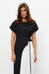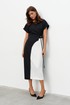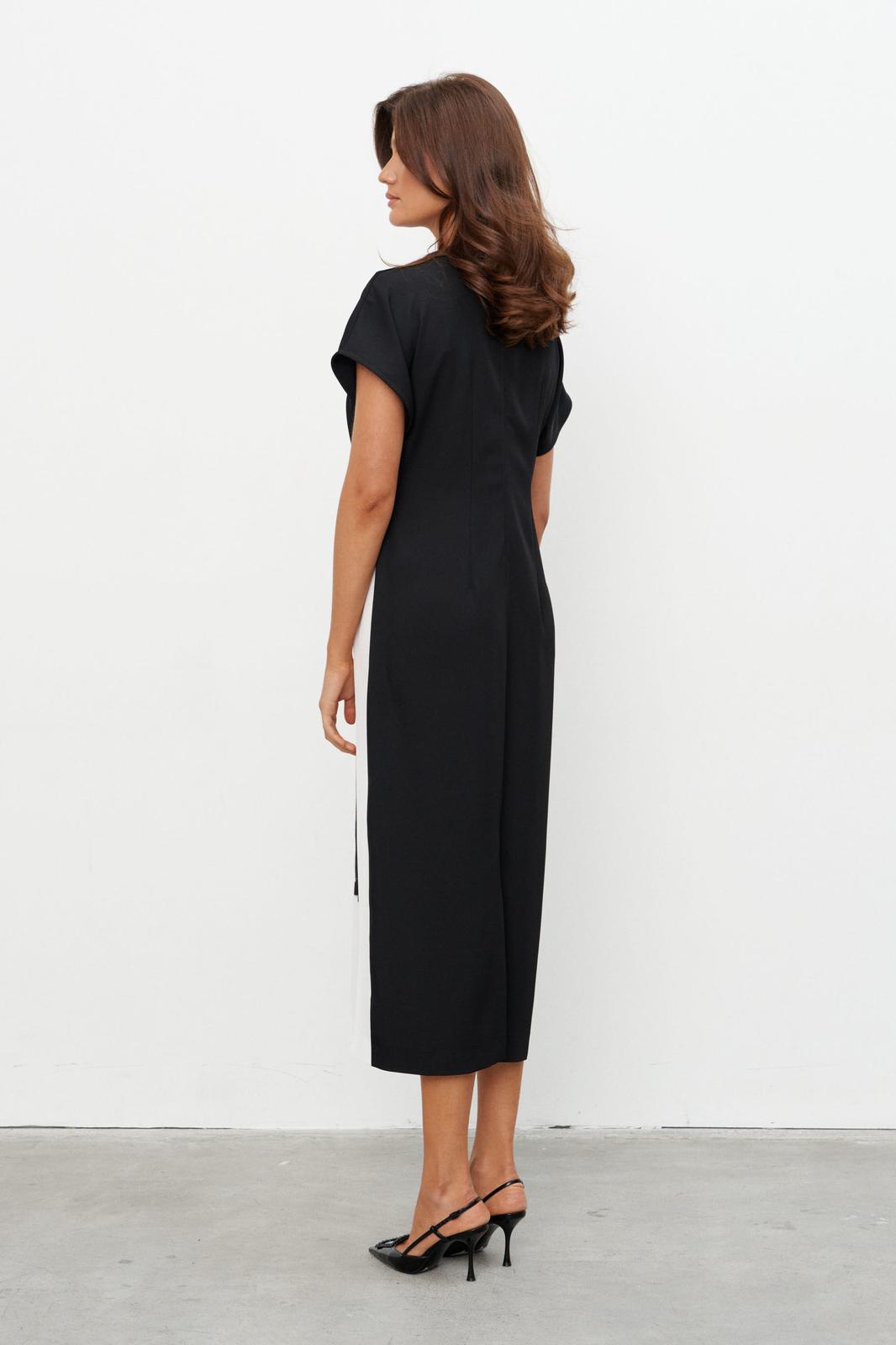 Платье длиной миди из струящейся ткани. Перед выполнен из двух контрастных деталей: Верхняя - чёрного цвета асимметричного кроя с декоративной завязкой на блестящий шнур в стразы и нижняя молочного цвета. Линия плеча спущена. Сзади разрез и застёжка на потайную молнию.