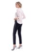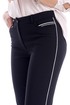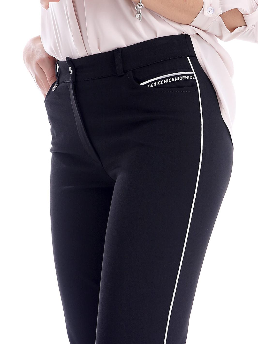 Брюки женские облегающего силуэта, заужены к низу. Застежка петля, пуговица, молния. На передних частях выполнены боковые карманы с отрезными бочками. Украшением служит декоративная лента на левом кармане. По спинке выполнены талиевые вытачки и прорезные карманы-имитация с планками. В боковые швы вшит серебристый кант. Посадка высокая. Длина шагового шва 78-81 см в зависимости от размера.