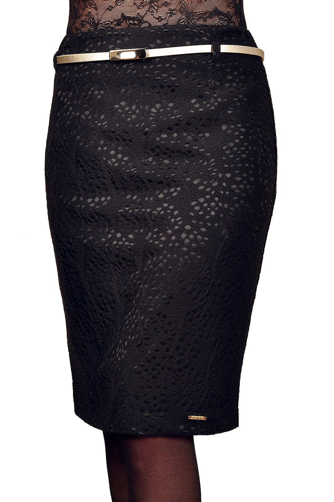 Юбка из текстильной ткани с плетеным рисунком. На подкладке, по спинке потайная молния, шлица. Ремень в комплект не входит.