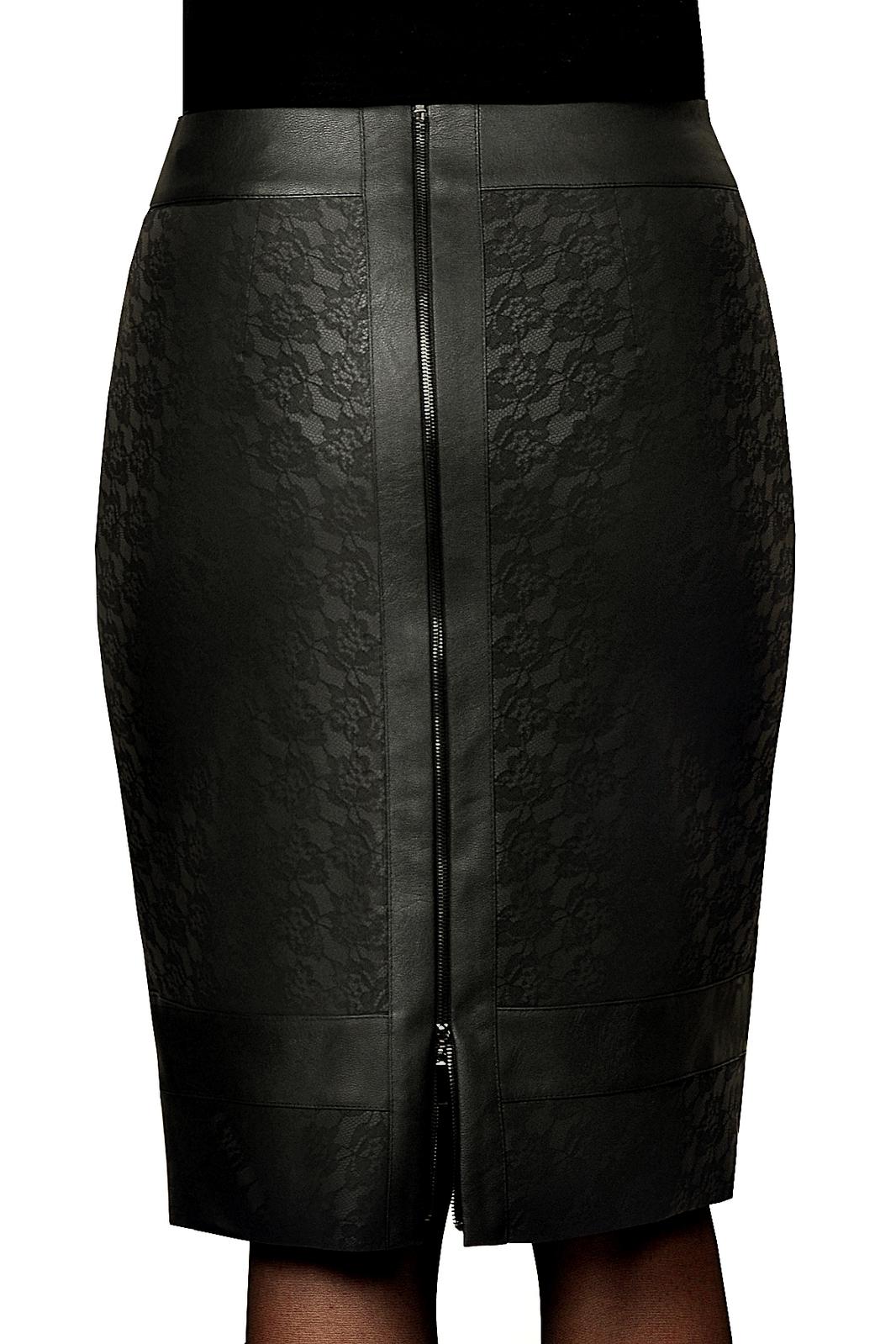 Юбка из комбинации двух тканей, обе экокожа. Одна из них имеет теснённый рисунок в виде кружева, что создаёт эффект бархатистости ткани. Другая ткань гладкая. По спинке по всему центральному шву вставлена металлическая молния. В левый боковой шов для большего удобства установлена застежка потайная молния. Юбка на подкладке. Замеры готового изделия 42 44 46 Обхват талии 68 72 76 Объем бедер 92 96 100 Длина 59 59 59 .Бережная стирка при 30 градусах!