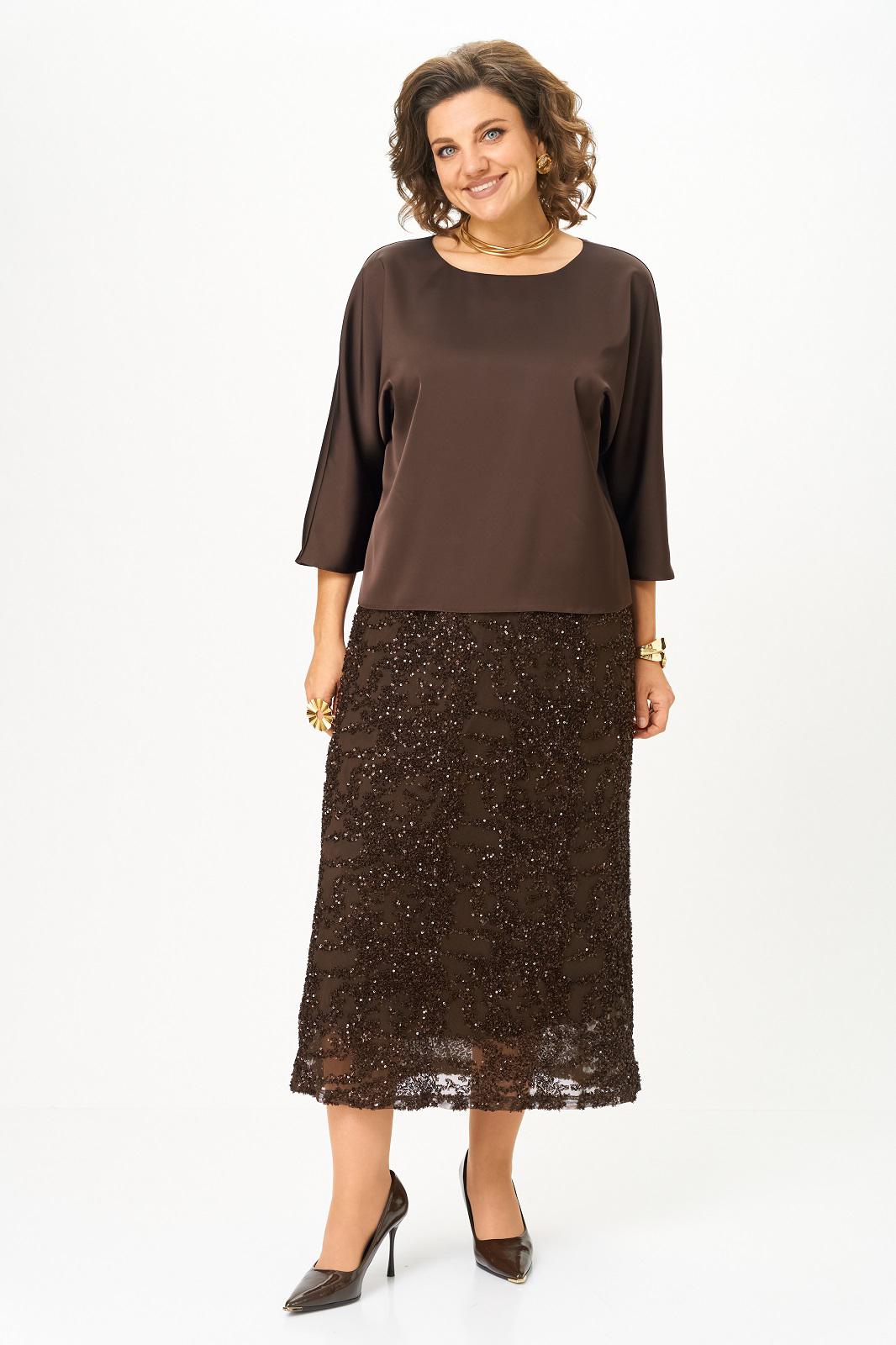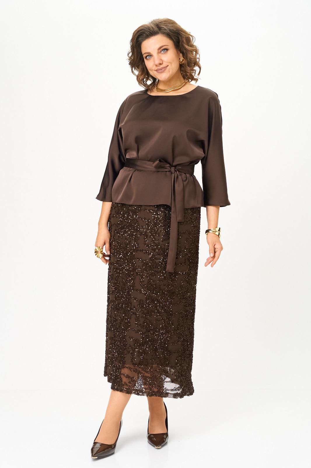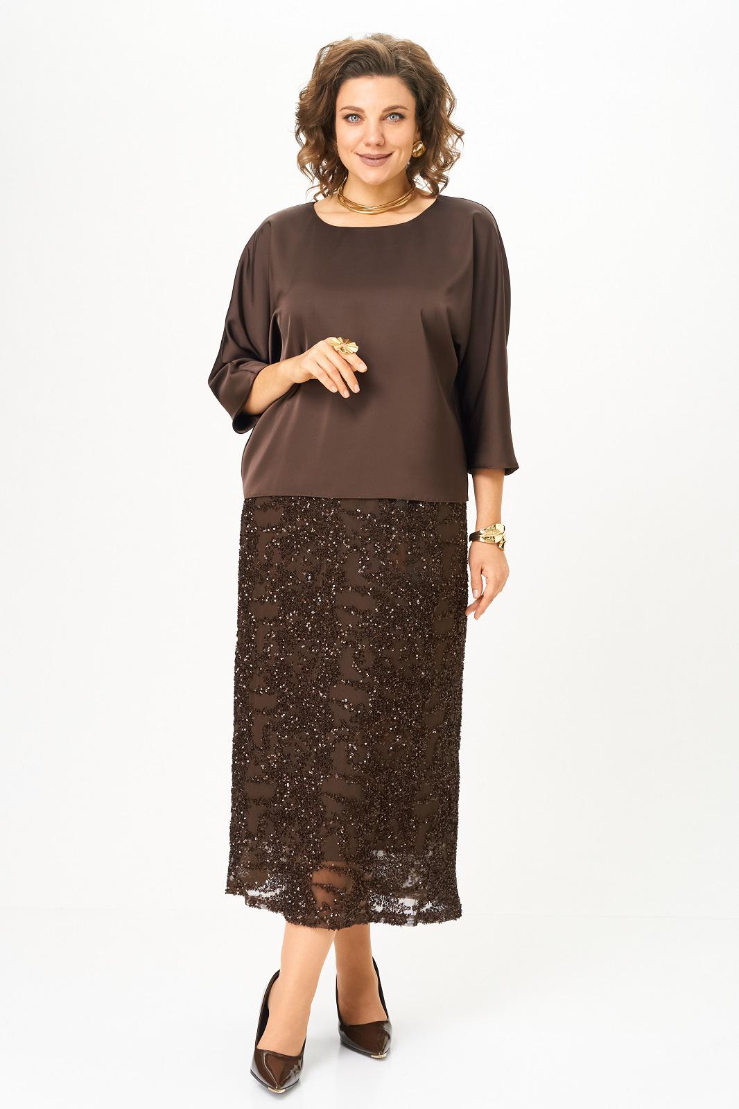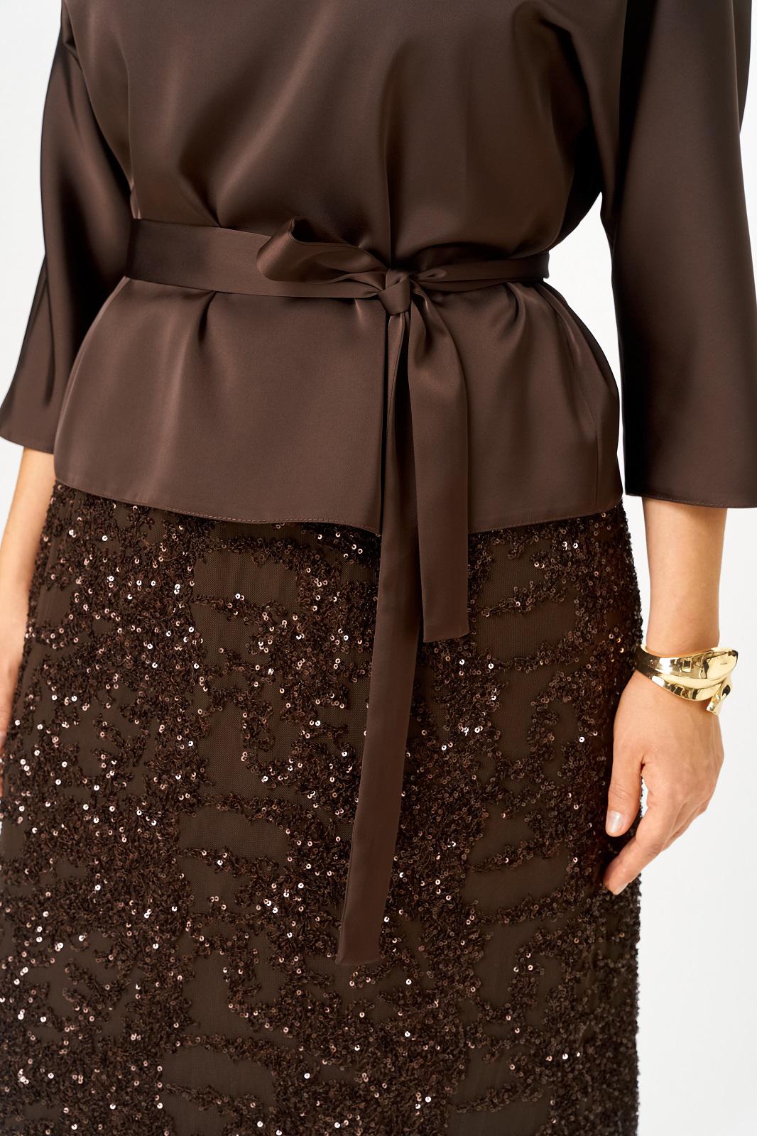 Нарядный женский комплект, состоящий из блузы и юбки. Блуза из атласной ткани с добавлением шелка, с цельнокроенным рукавом 3/4, вырез горловины лодочка с застежкой на петлю с пуговицей по спинке, пояс съемный на завязку. Юбка прямая двойная, верхний слой - сетка с паетками, нижний - атлас, пояс отрезной по талии.