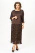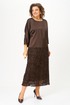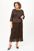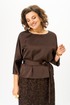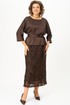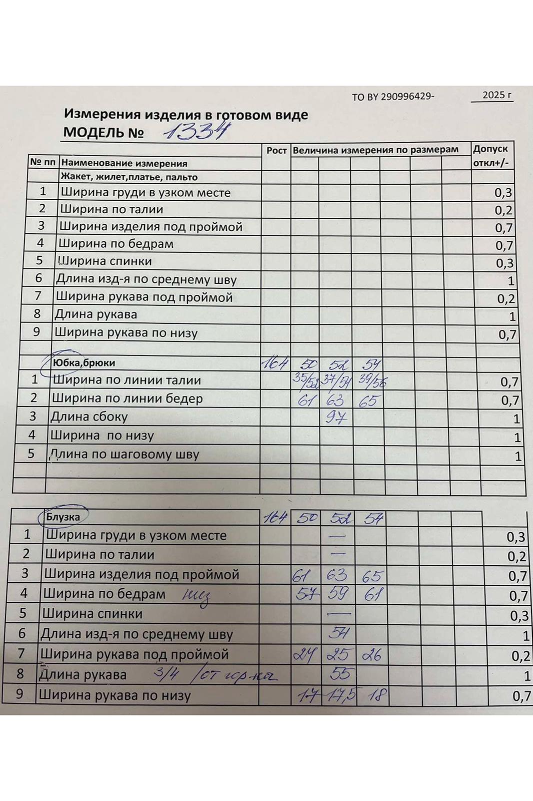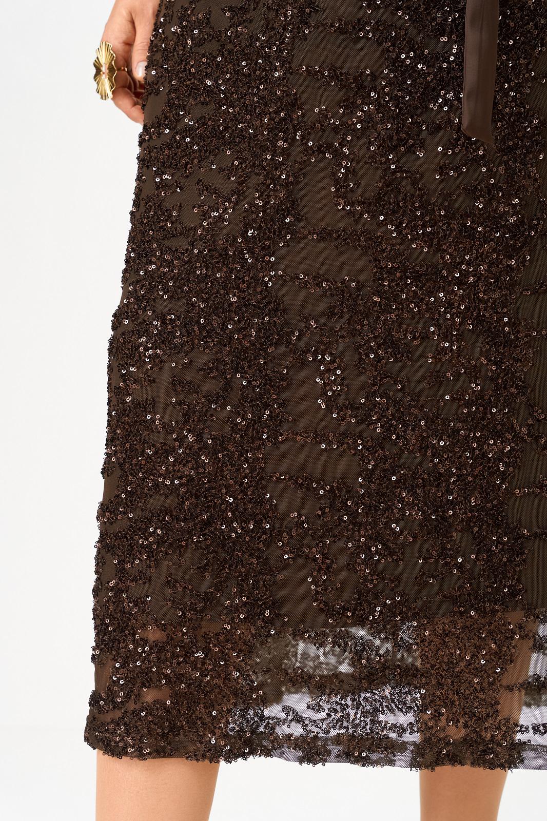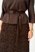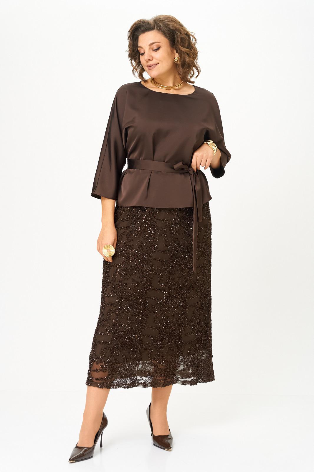 Нарядный женский комплект, состоящий из блузы и юбки. Блуза из атласной ткани с добавлением шелка, с цельнокроенным рукавом 3/4, вырез горловины лодочка с застежкой на петлю с пуговицей по спинке, пояс съемный на завязку. Юбка прямая двойная, верхний слой - сетка с паетками, нижний - атлас, пояс отрезной по талии.