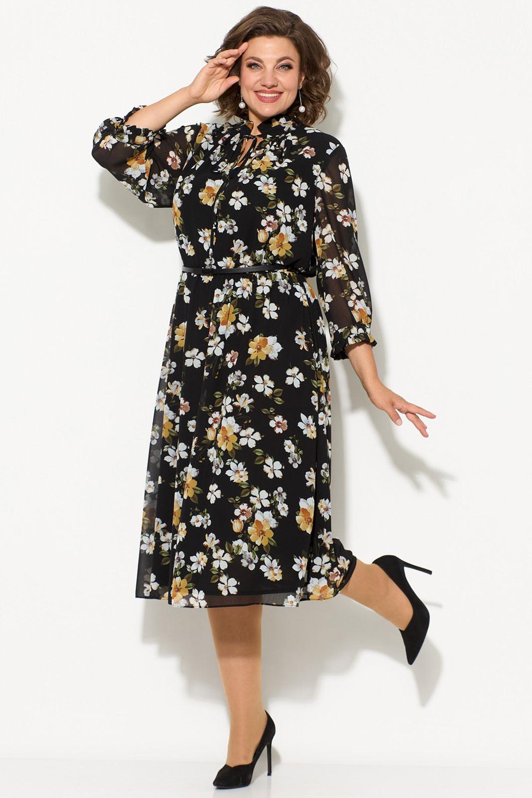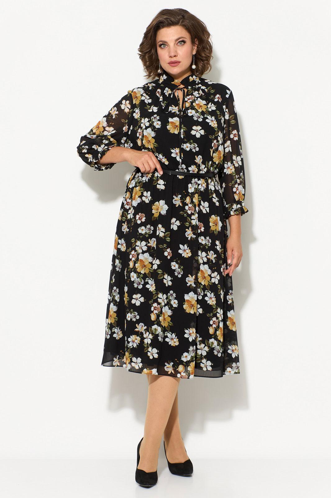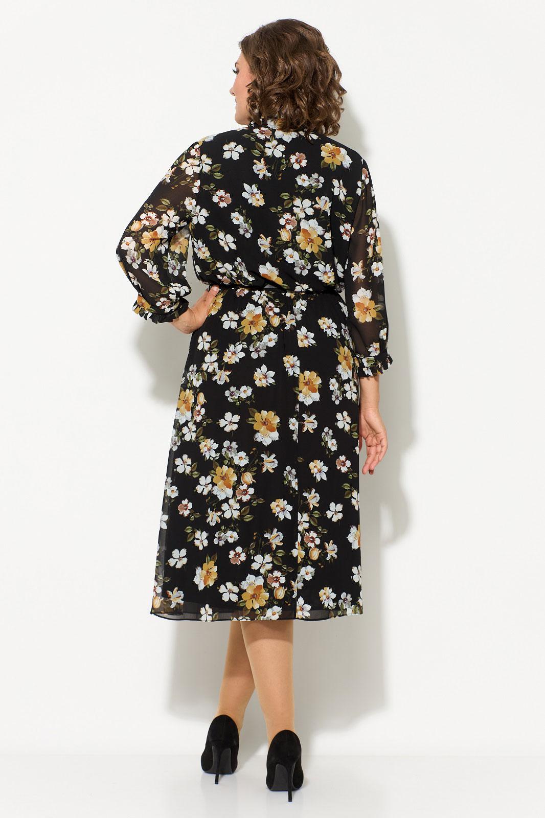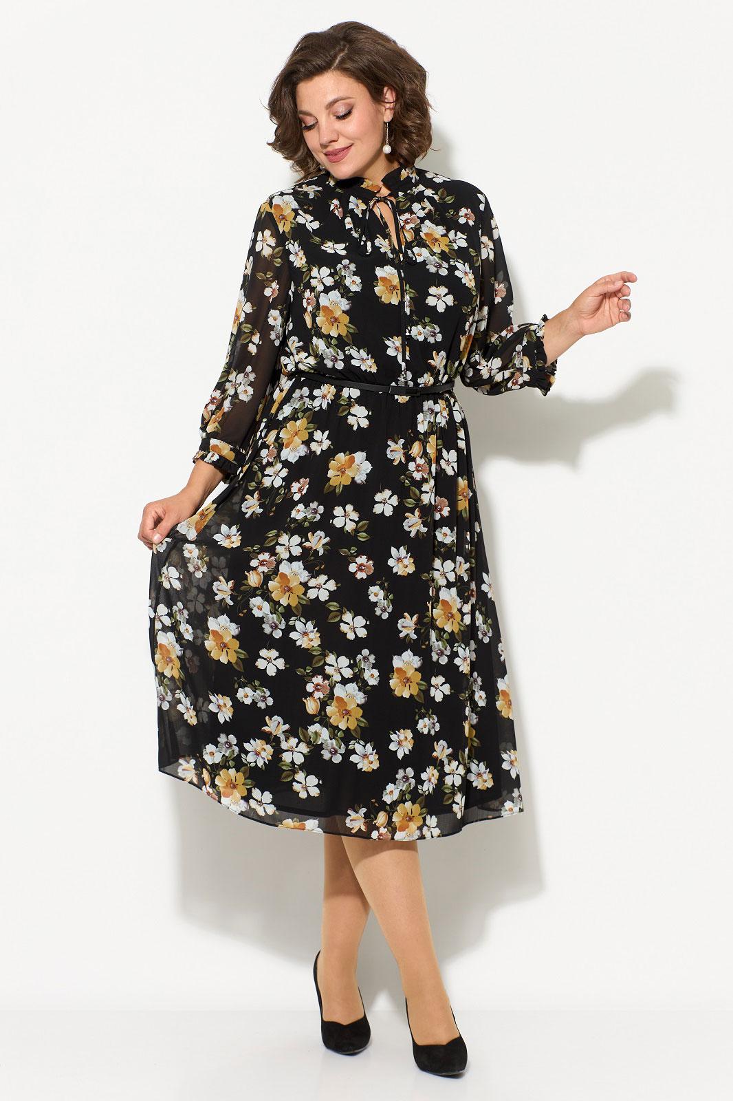 Нарядное женское платье из шифоновой ткани с принтом, на подкладке, длиной ниже колена, отрезное по линии талии, на резинке, юбка слегка расширена к низу.