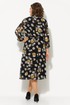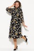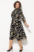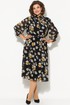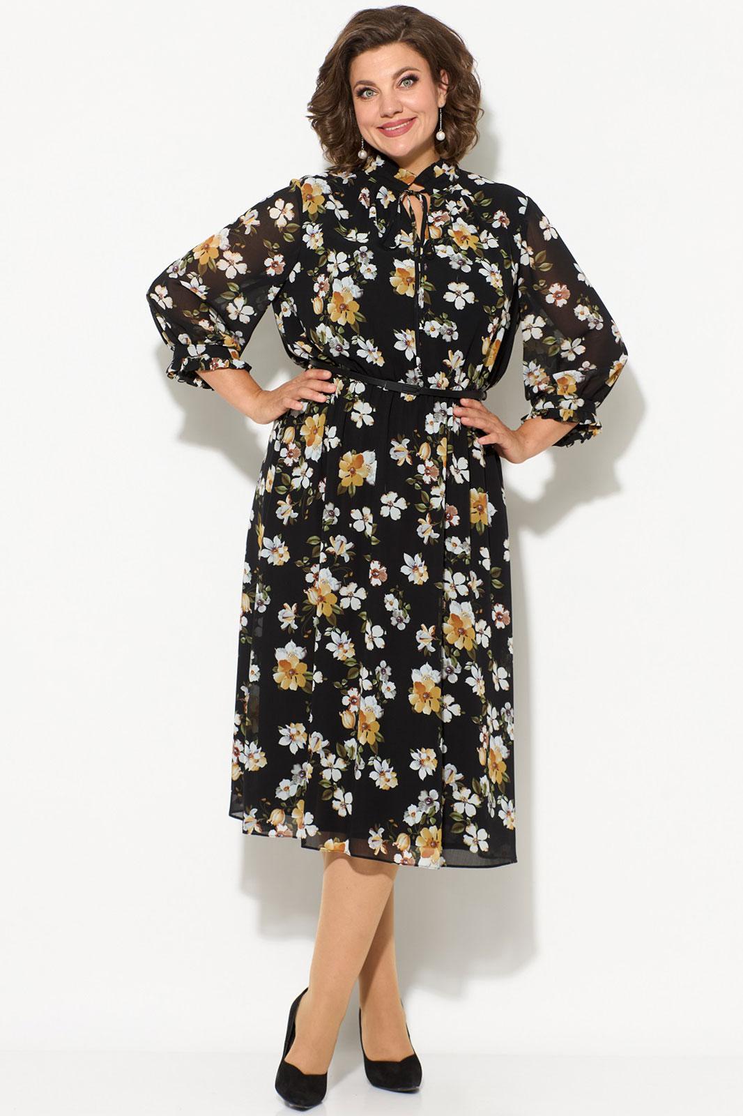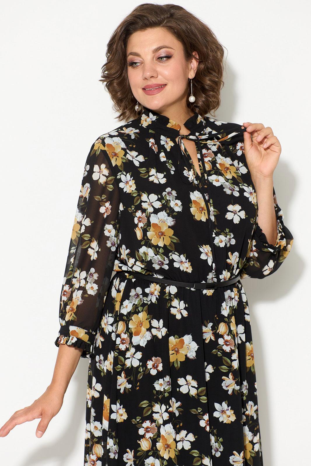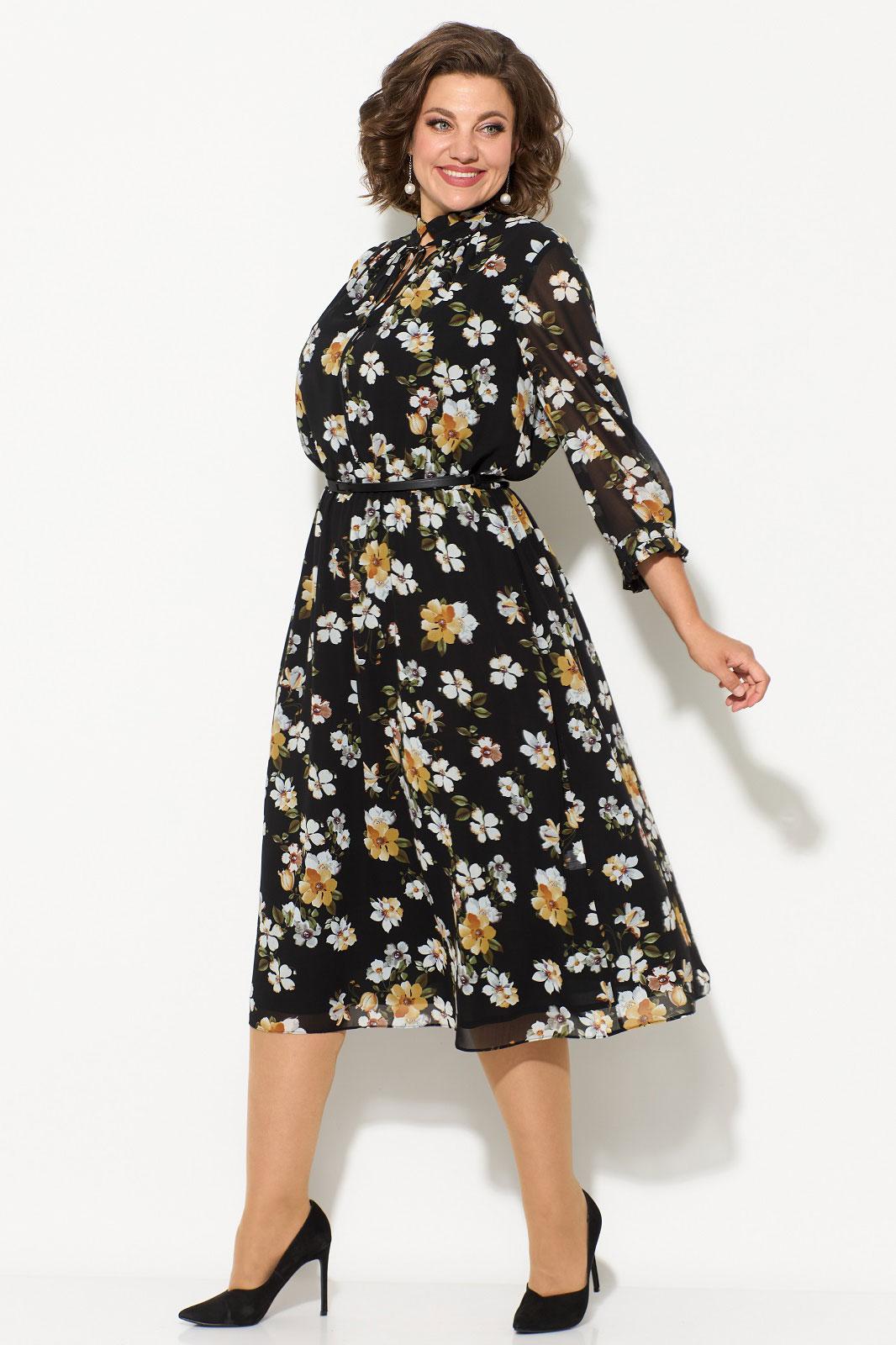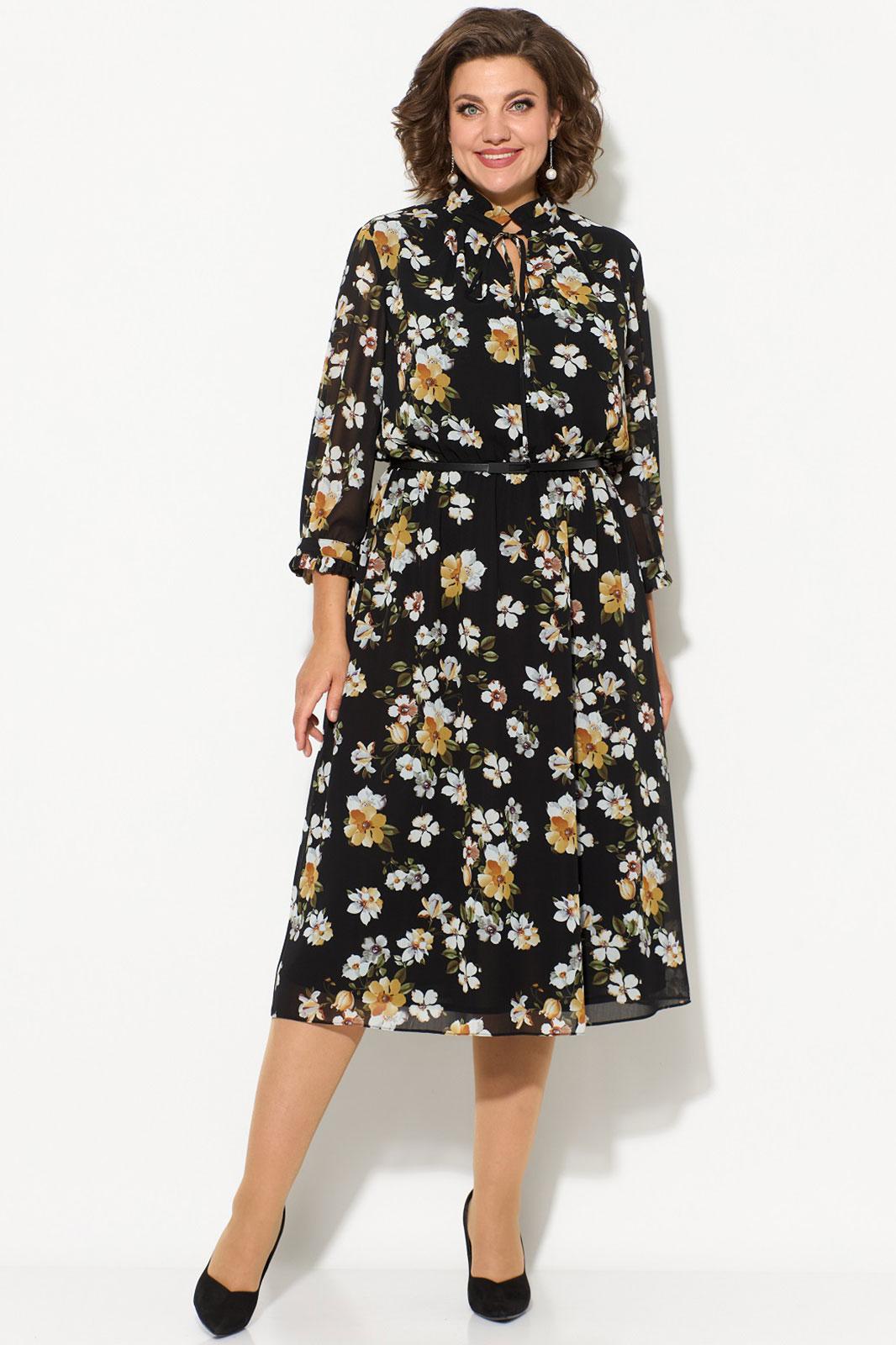 Нарядное женское платье из шифоновой ткани с принтом, на подкладке, длиной ниже колена, отрезное по линии талии, на резинке, юбка слегка расширена к низу.
