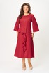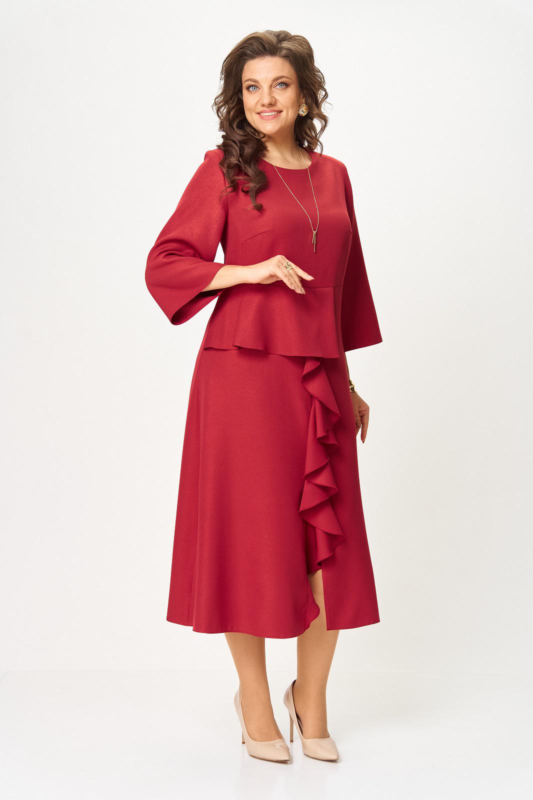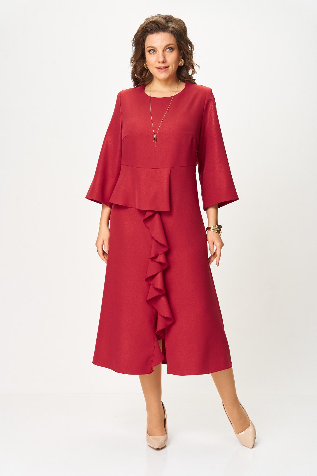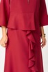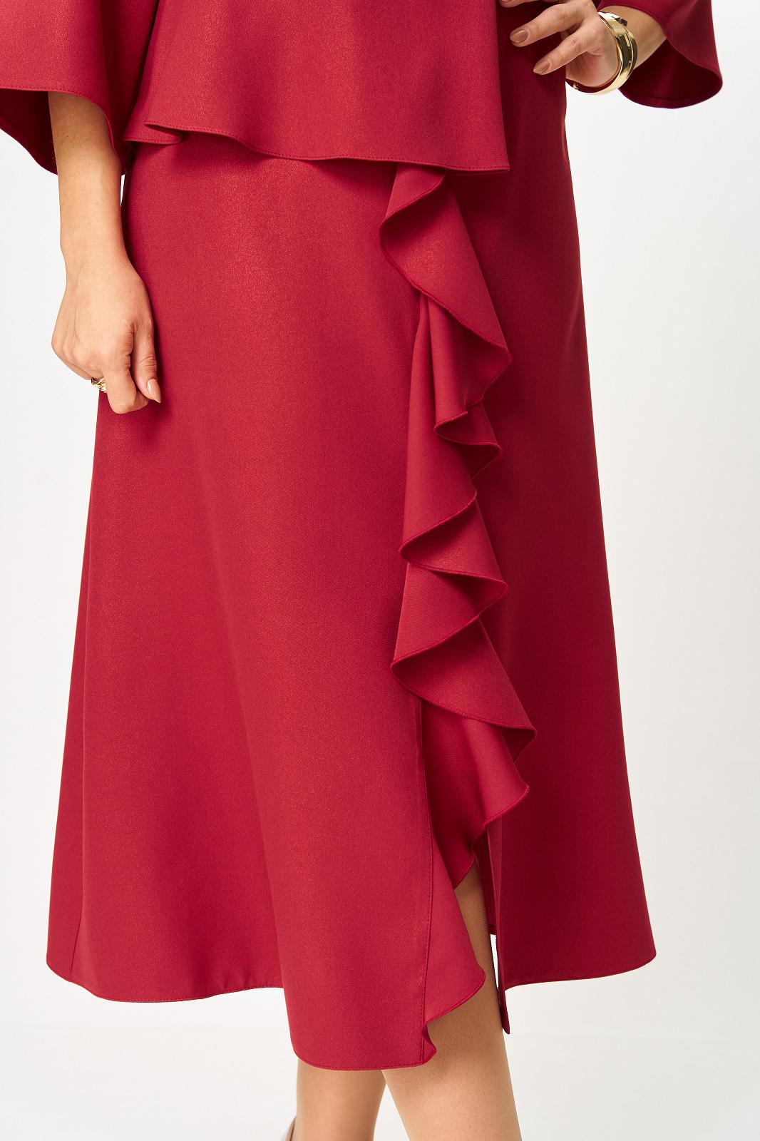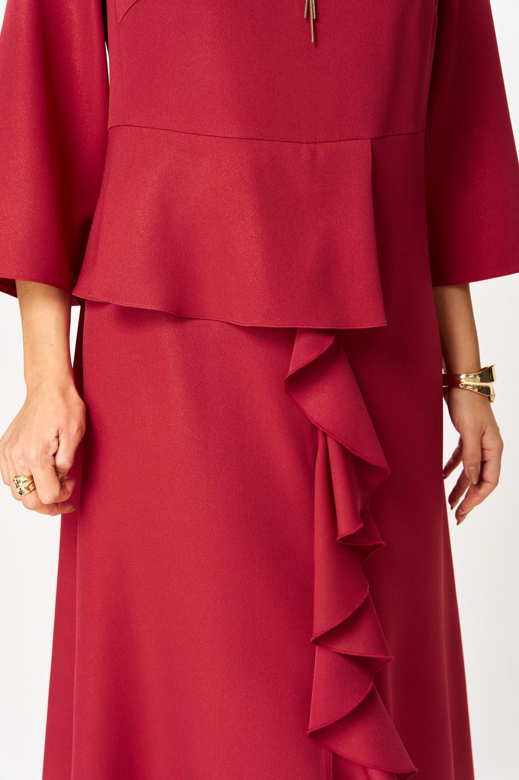 Нарядное женское платье из плательной ткани с легким блеском. Удлиненное, силуэт полуприлегающий, по переду отрезное по линии талии, с баской, воланом в шве и высоким разрезом по низу, вырез горловины круглый, с застежкой на потайную молнию в среднем шве по спинке, рукав 3/4 расширенный к низу.