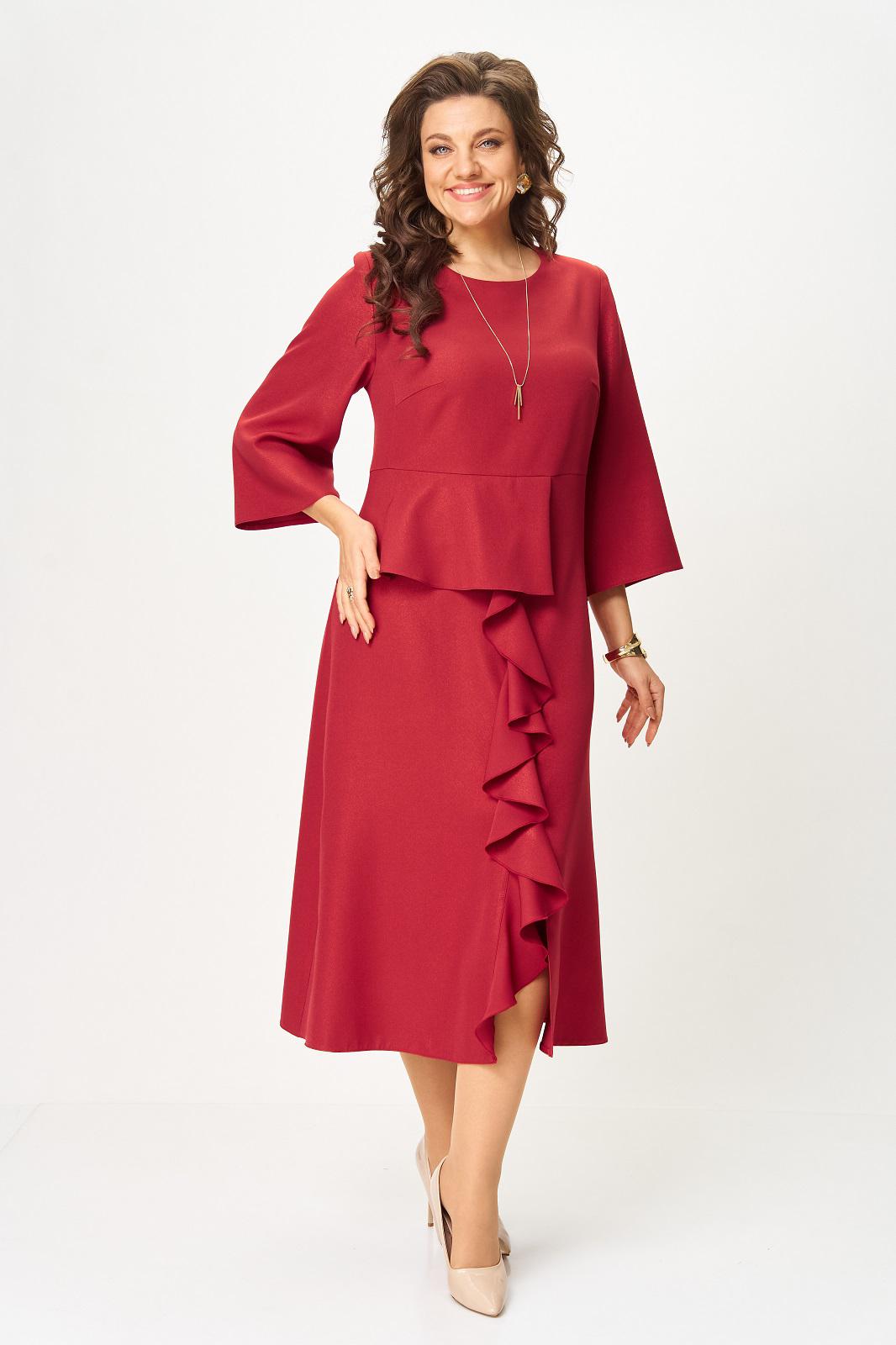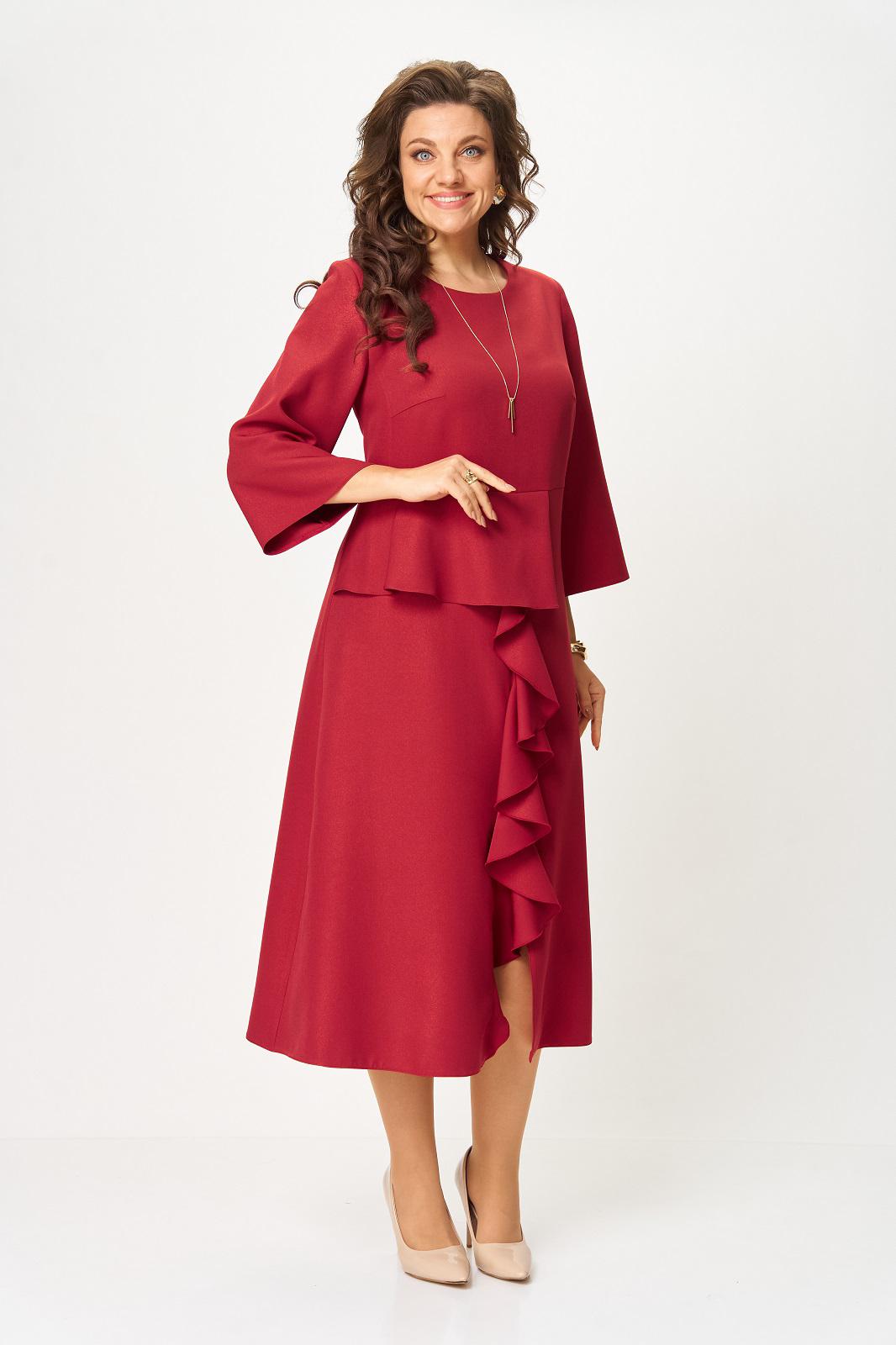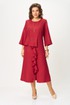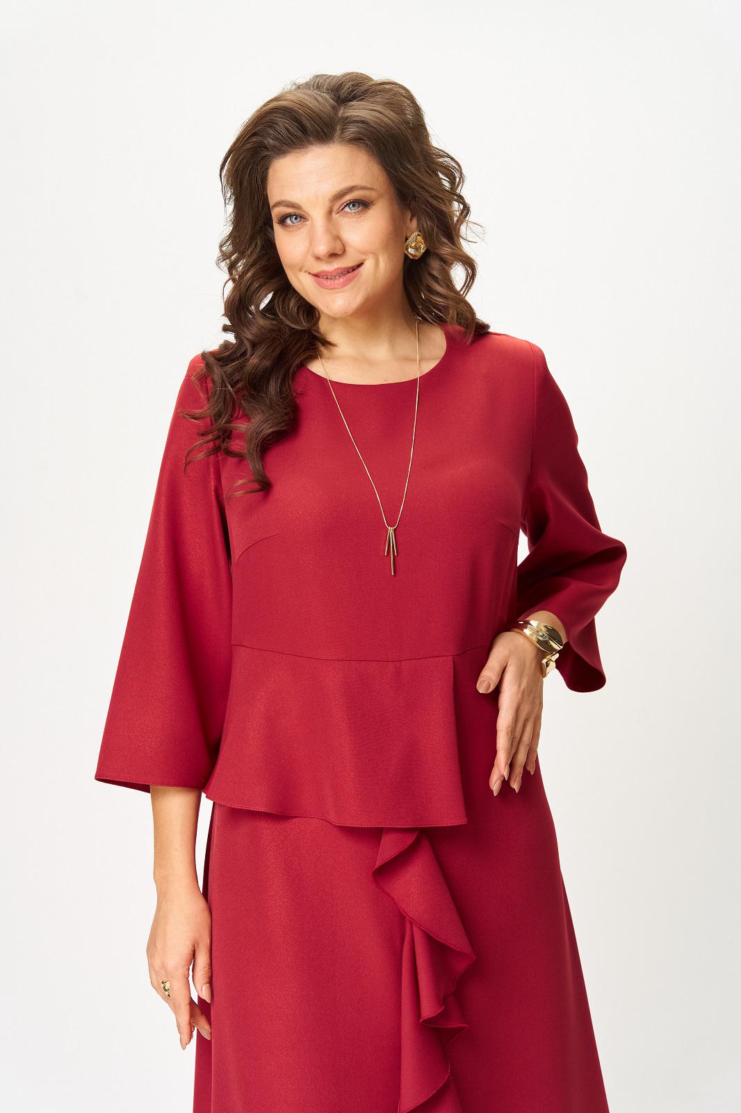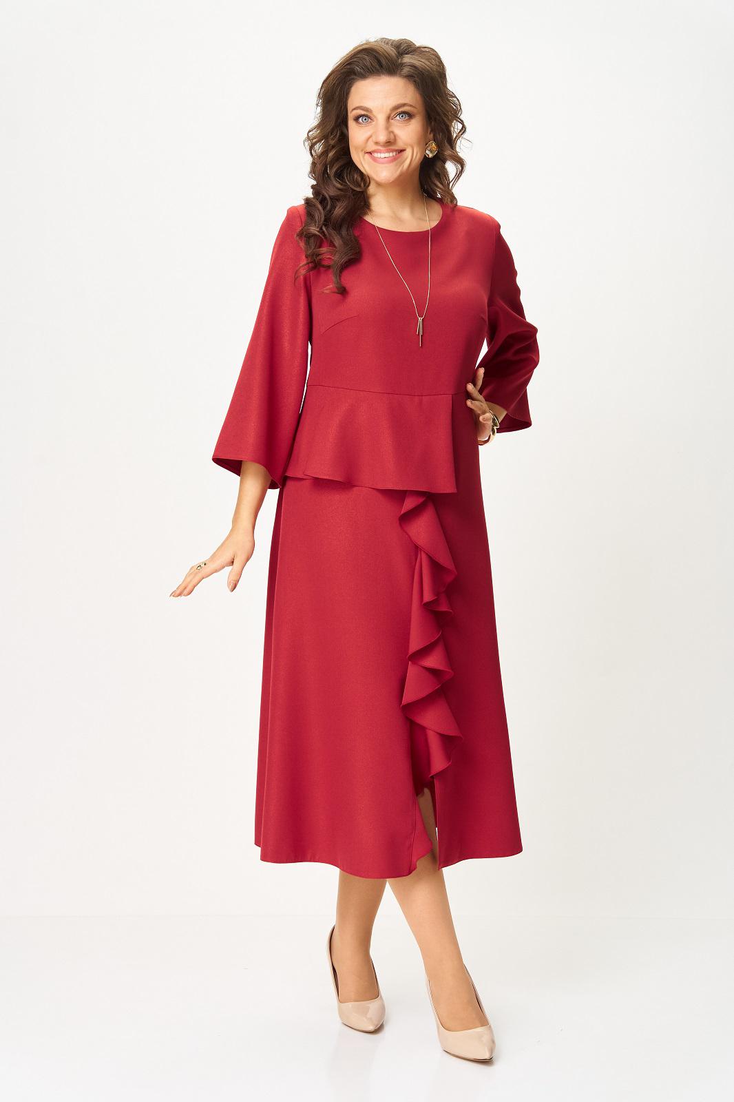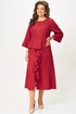 Нарядное женское платье из плательной ткани с легким блеском. Удлиненное, силуэт полуприлегающий, по переду отрезное по линии талии, с баской, воланом в шве и высоким разрезом по низу, вырез горловины круглый, с застежкой на потайную молнию в среднем шве по спинке, рукав 3/4 расширенный к низу.