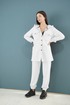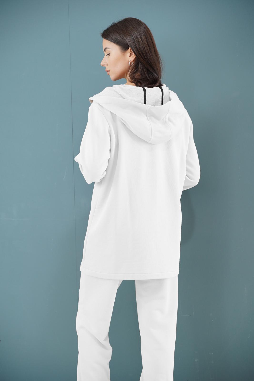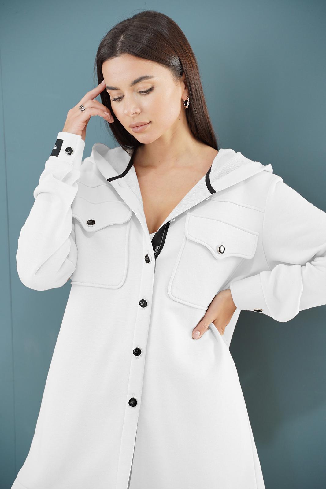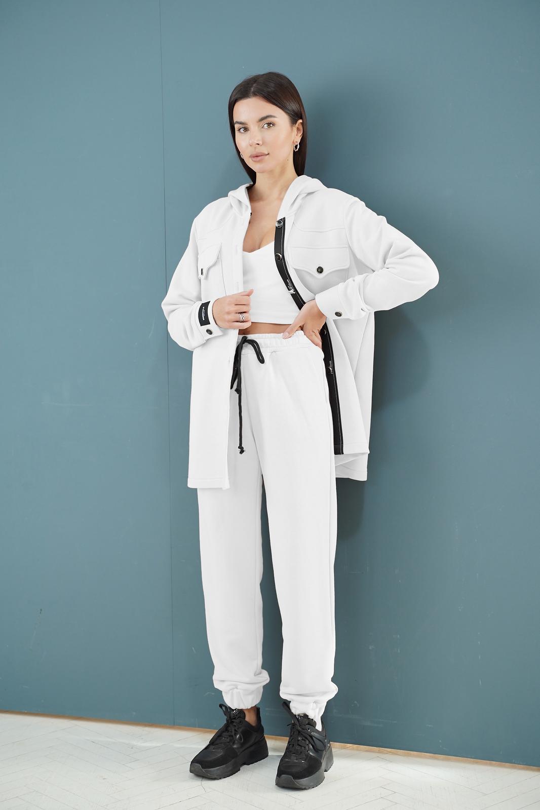 Костюм женский из трикотажного полотна с капюшоном. Жакет прямого силуэта. Застёжка центральная на петли пуговицы. По линии груди накладные карманы с фигурным клапаном, застёгивающимся на пуговицы. Полочка с фигурной кокеткой. Рукав втачной, одношовный на манжете. По краю левого борта настрочена декоративная тесьма. Брюки прямые с карманами в боковом шве. Пояс брюк на резинке. Длина жакета 74 см. Длина спуска рукава 15 см. Длина рукава от линии спуска 67 см. Длина брюк 101 см.