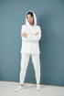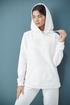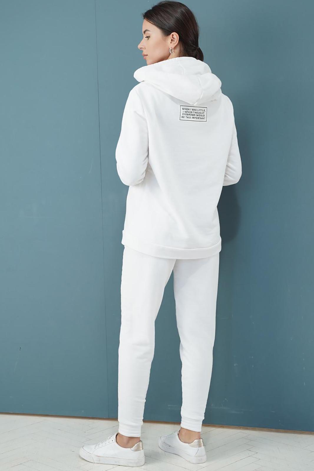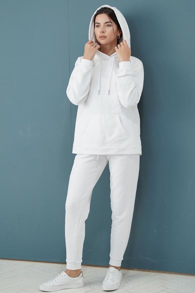 Костюм выполнен из трикотажного полотна. Свитшот прямого силуэта, с капюшоном затягивающемся с помощью декоративного шнура. По переду фигурный карман кенгуру. Линия плеча расширена, рукав рубашечный на манжете. Брюки заужены к низу, с карманами в боковом шве. Низ брюк на манжете. Пояс брюк на резинке. Длина кофта 62 см. Длина рукава 65 см. Длина брюк 97 см.