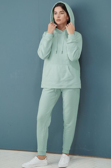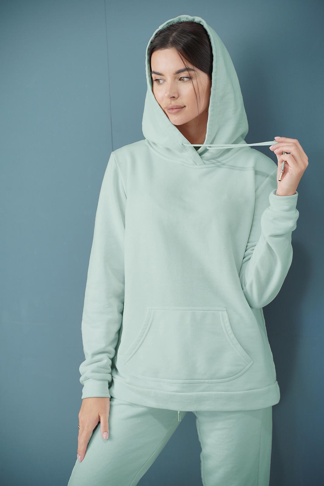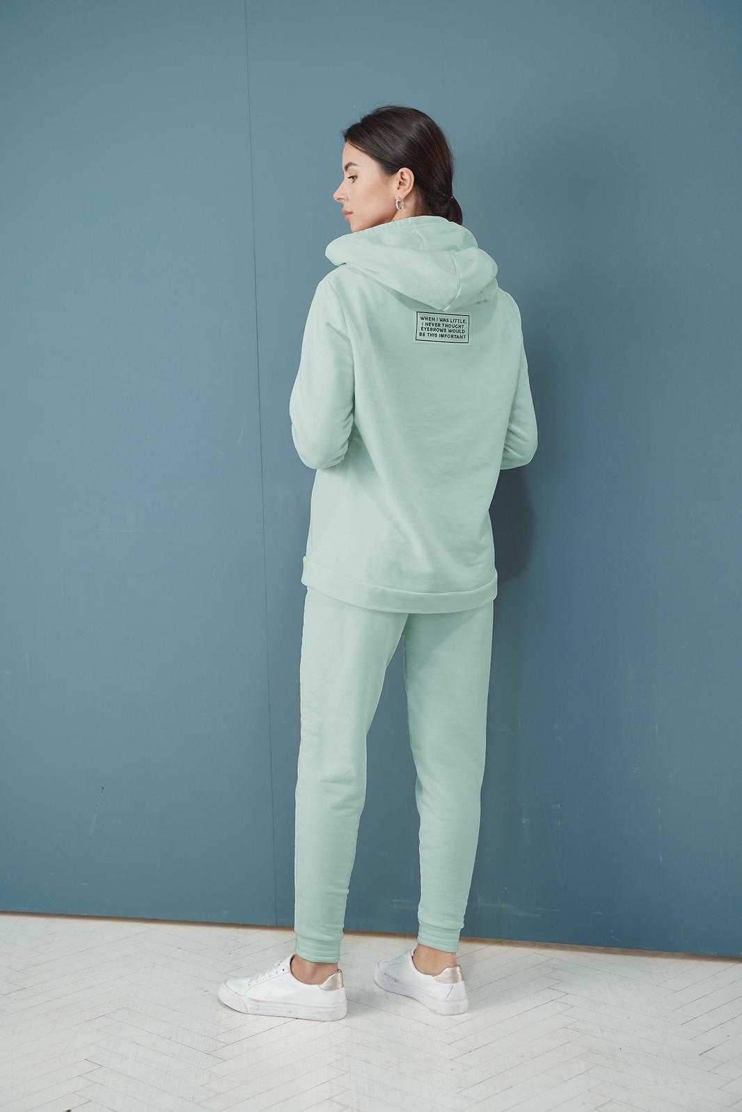 Костюм выполнен из трикотажного полотна. Свитшот прямого силуэта, с капюшоном затягивающемся с помощью декоративного шнура. По переду фигурный карман кенгуру. Линия плеча расширена, рукав рубашечный на манжете. Брюки заужены к низу, с карманами в боковом шве. Низ брюк на манжете. Пояс брюк на резинке. Длина кофта 62 см. Длина рукава 65 см. Длина брюк 97 см.