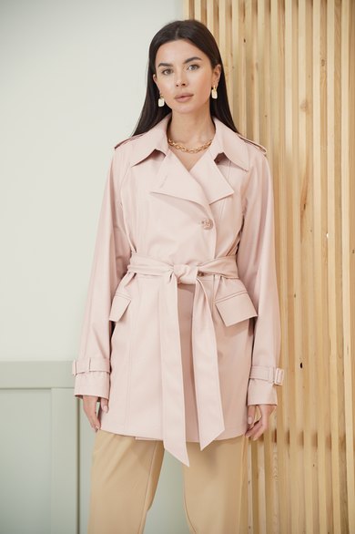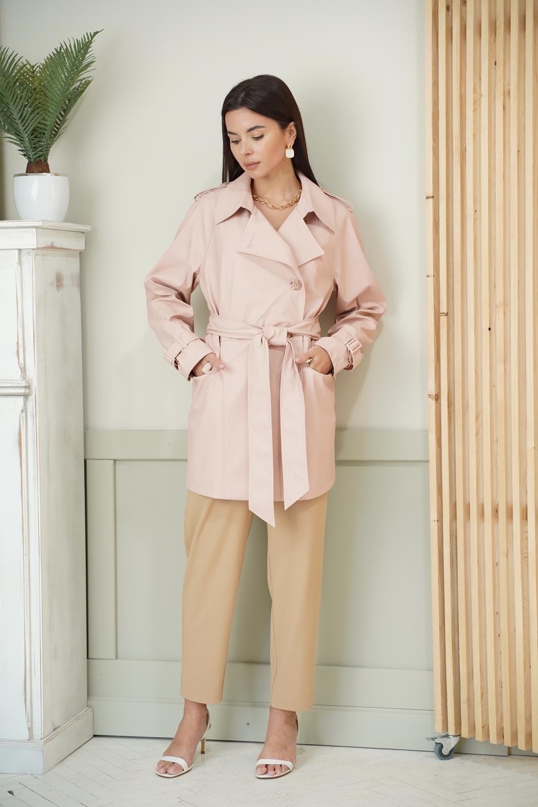 Куртка из эко-кожи на подкладке. Застёжка двубортная на петли пуговицы.По переду прорезной карман с клапаном и двумя обтачками. Спинка со средним швом. Рукав реглан. По низу рукава пата, застёгивающаяся на пряжку, по плечу пата - погон с петлёй и пуговицей. Воротник пиджачный с отрезной стойкой. В комплекте завязывающийся пояс из основной ткани. Длина куртки см. Длина рукава см.