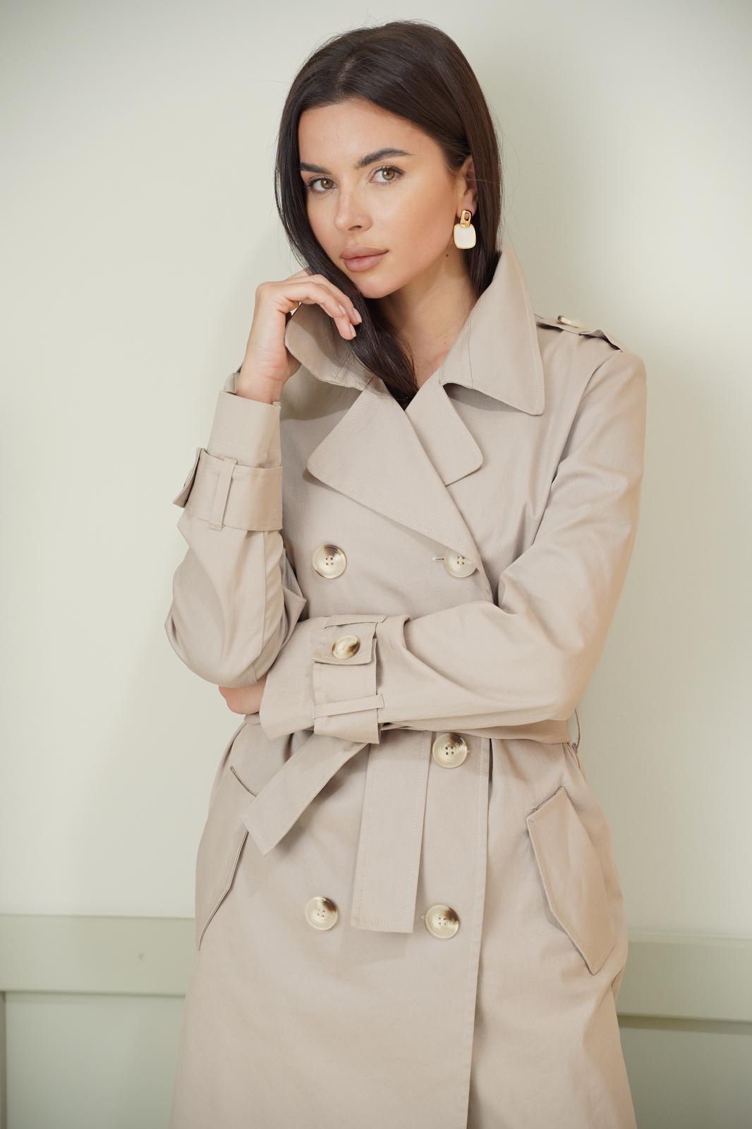 Плащ прямого силуэта, без подкладки, внутренние срезы швов окантованы отделочной тканью. Застёжка двубортная на 3-и петли-пуговицы. По переду прорезные карманы с клапанами. Рукав втачной,двухшовный. По низу рукава пата, по плечу пата-погон, застёгивающиеся на пуговицы. Спинка со средним швоми шлицей по низу. Воротник пиджачный, с отрезной стойкой. В комплекте завязывающийся пояс из основной ткани. Длина плаща 109 см. Длина рукава 62 см.