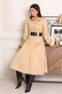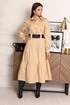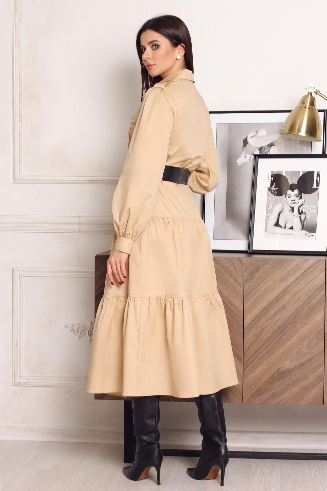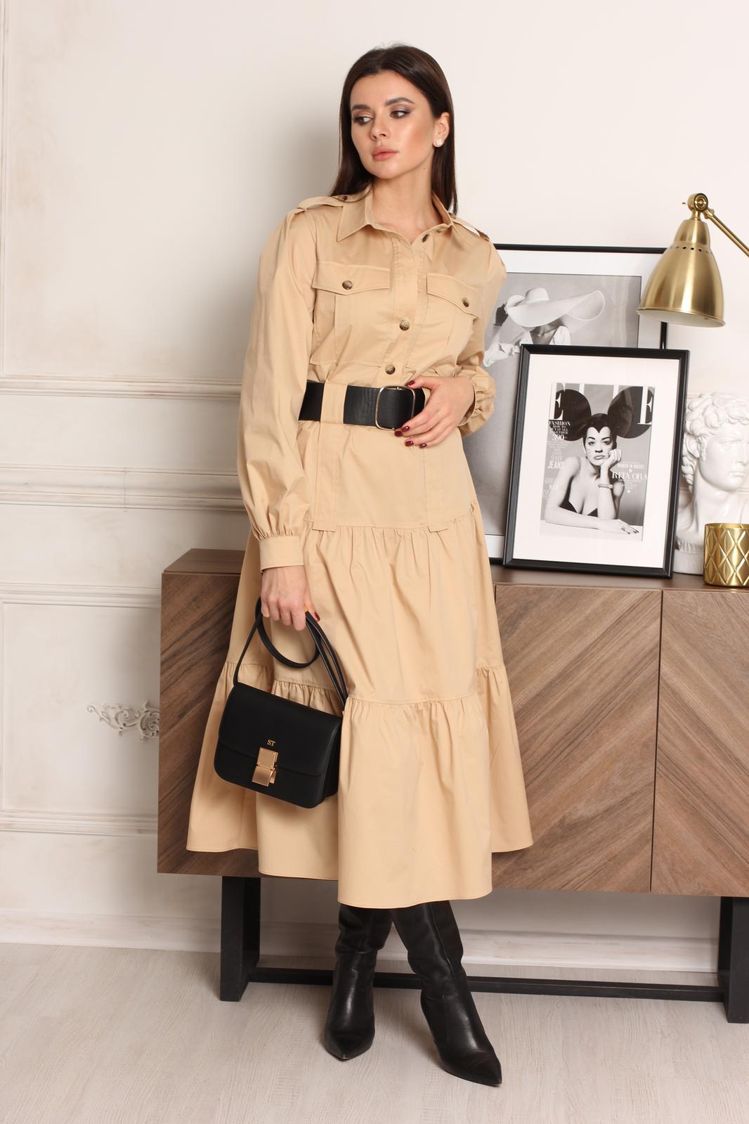 Платье женское, полуприлегающего силуэта, отрезное по линии бедра. Застёжка центральная до линии талии, с отрезными планками на петли-пуговицы. Воротник рубашечный с отрезной стойкой. Полочка с накладными карманами с клапаном, застёгивающимся на пуговицы. От верха кармана до линии бедра декоративная деталь шириной 4,0 см, по линии талии оставлено место для продевания шлёвки. От линии бедра по полочке и спинке пришито 2 широких волана. Рукав втачной, одношовный, по окату бантовая складка. По плечу пата -погон застёгивающаяся на пуговицу. Длина платья 123 см. Длина рукава 62 см. *Ремень входит в комплектацию.