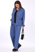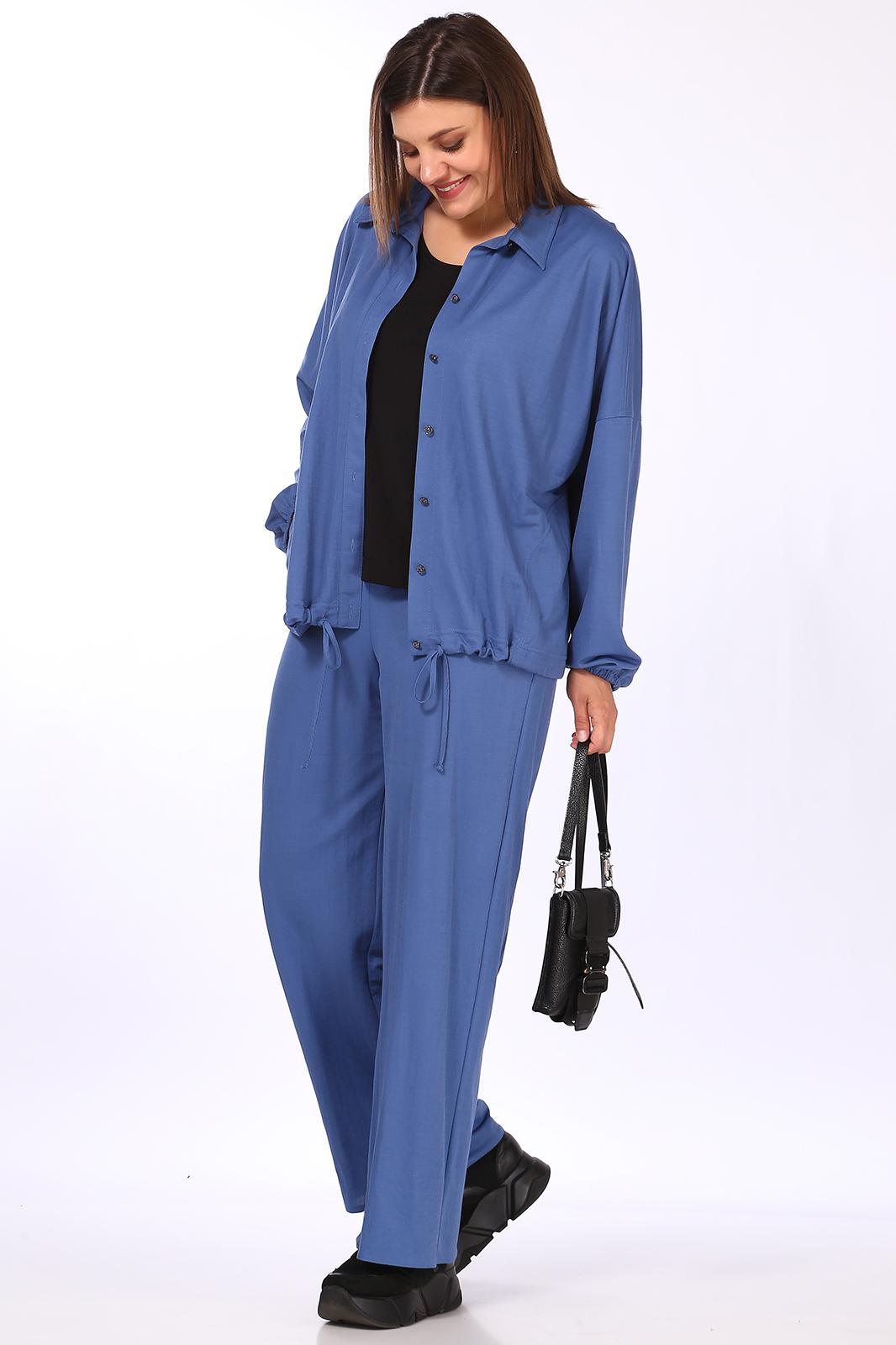 Стильный женский комплект из трикотажной ткани. Блуза свободного силуэта, воротник рубашечного типа на стойке, рукав втачной на спущенной пройме со сборкой на эластичной ленте. Застежка петли, пуговицы. По низу полочки регулируемая кулиска. В боковых швах карманы. Брюки свободного силуэта, пояс на резинке.