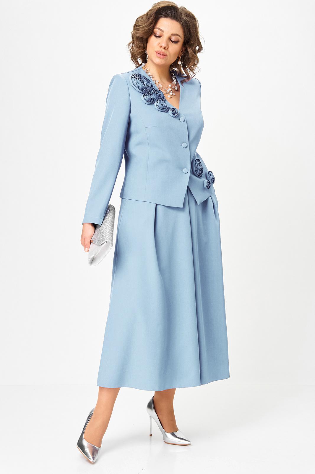 Элегантный юбочный костюм, стильный и универсальный наряд для торжественных и праздничных мероприятий. Обеспечит вашему образу максимум внимания и комплементов , благодаря безупречному подбору цвета и художественному оформлению цветочной аппликации ! Жакет с подкладкой по полочке , полуприлегающего силуэта с v образным вырезом , рукав втачной двух шовный . Юбка без подкладки, на поясе с боковыми резинками, расклешенного силуэта со складками по переду и боковыми карманами .