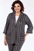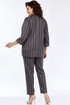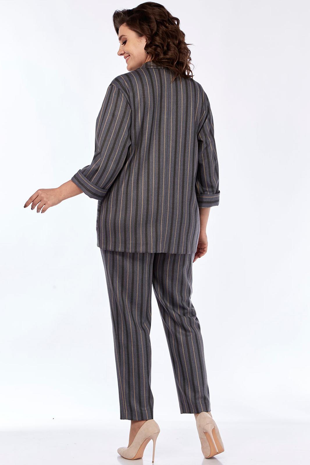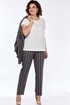 Костюм женский стильный офисный деловой брючный. Костюм брючный трех предметный. Состоит из жакета, блузы (полиэстер 100%) с коротким рукавом и брюк. Жакет прямого силуэта, без подкладки, удлиненный. Воротник пиджачного типа. Центральная застежка на петлю и пуговицу в размерах 48-52 и на две пуговицы 54-58. Детали переда с нагрудными вытачками, с большими накладными карманами с закругленными концами и клапанами, переходящими на спинку. На правой детали переда нагрудный накладной карман. Спинка со средним швом. Рукава втачные одношовные длиной 3/4. Низ рукавов с отложными манжетами. Карманы, клапаны, манжеты из отделочного материала. Блуза прямого силуэта, с круглым вырезом горловины, короткими цельнокроенными рукавами. Длина блузы по спинке 62-65 см. Брюки заужены к низу. Верхний срез брюк обработан притачным поясом, застегивающимся на петлю и пуговицу, по спинке на широкой эластичной тесьме. Центральная застежка на тесьму-молнию. Наклонные карманы в боковых швах. Задняя часть брюк с талиевыми вытачками, имитацией карманов с листочкой. С разрезами по низу.