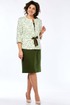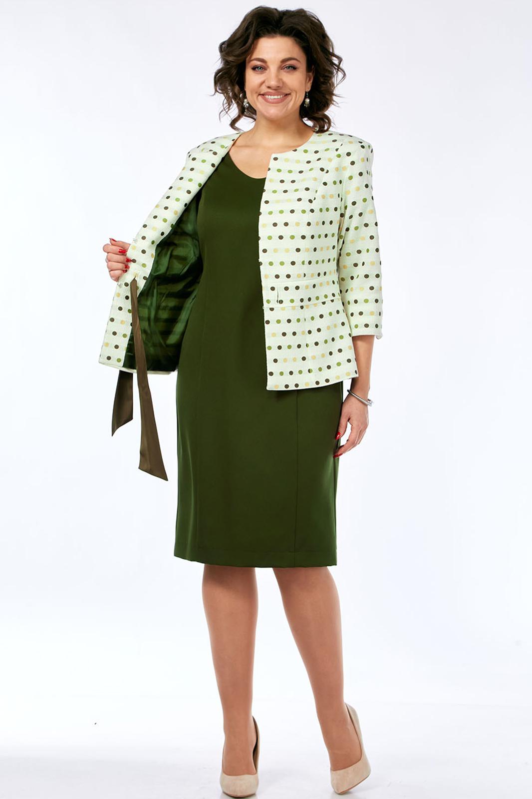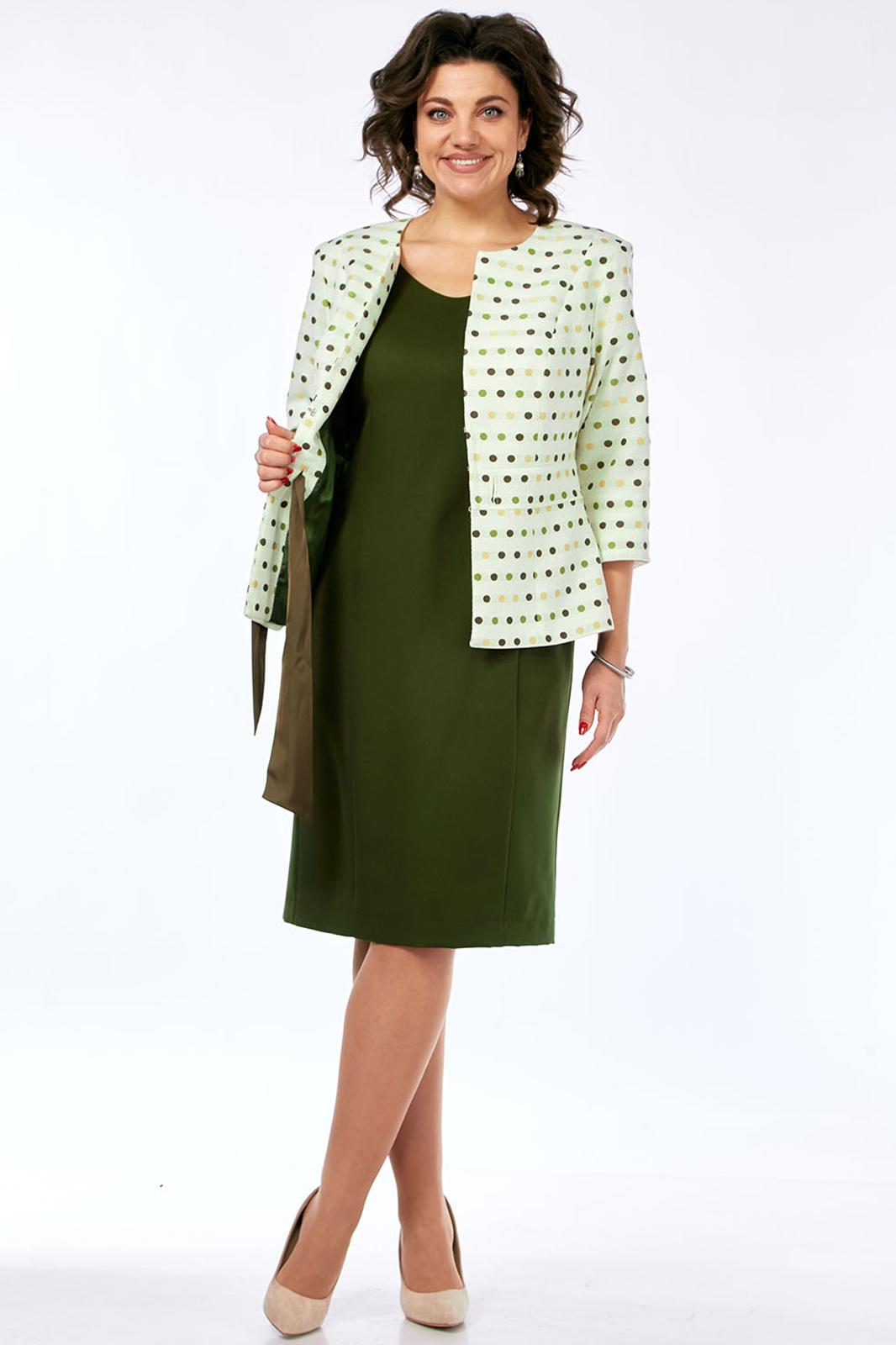 Комплект женский 2-х предметный, состоящий из жакета и платья, из текстильного материала. Платье женское полуприлегающего силуэта из атласного материала, на подкладке. С углубленным вырезом горловины. Перед платья с рельефными швами от проймы до низа изделия. Спинка со средним швом, заканчивающимся разрезом. В левом боковом шве потайная застежка на тесьму молнию. Рукава короткие. Жакет женский полуприлегающего силуэта, на подкладке. С круглым вырезом горловины. Детали переда с рельефными швами от плечевых швов до низа изделия. По талии отделочная деталь с петлями и вдетым в него пояском. Спинка со средним швом и рельефами от плечевых швов до низа. Рукава втачные 2-х шовные, с разрезами по локтевым швам. Центральная застежка на крючки.