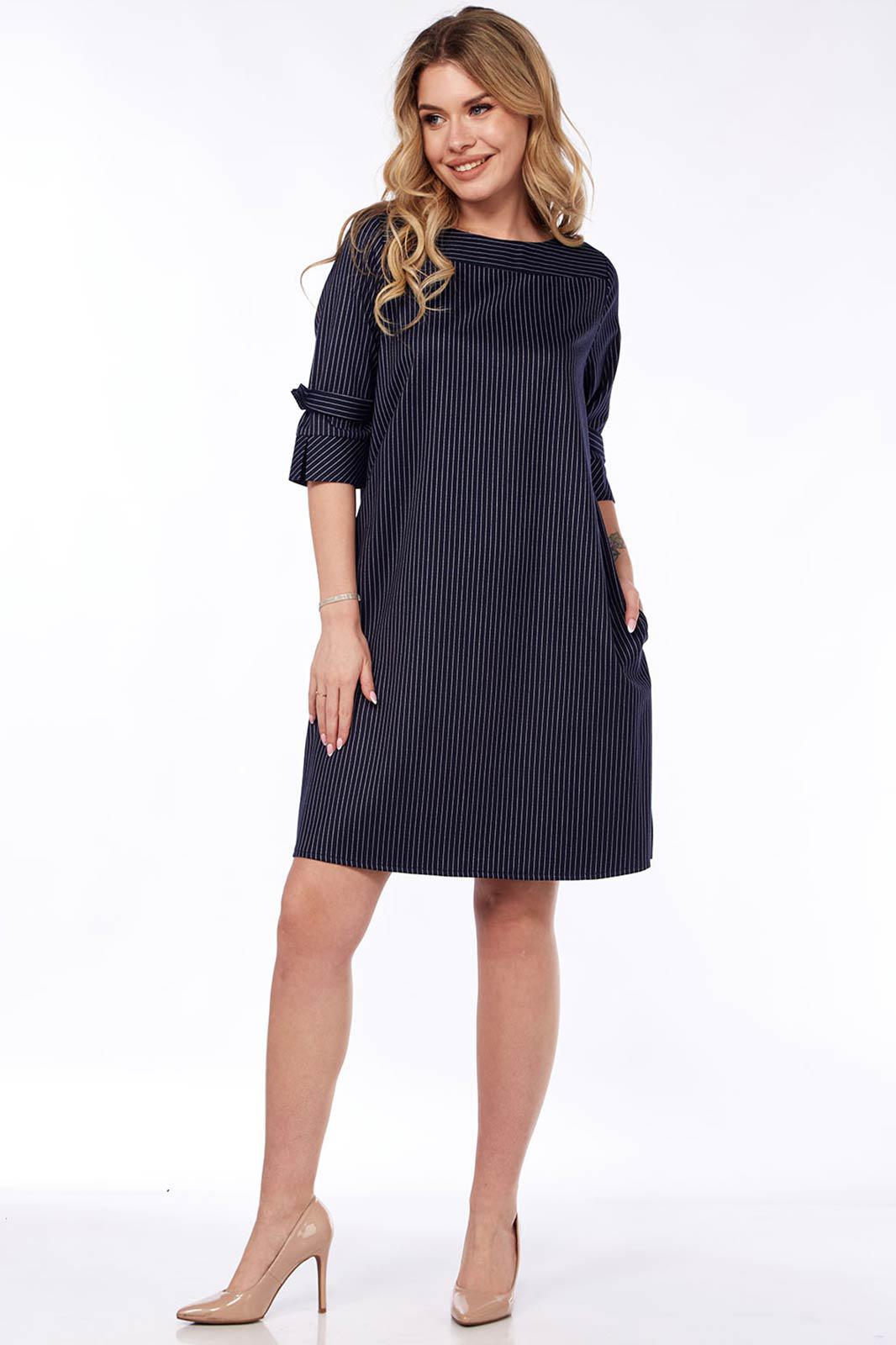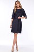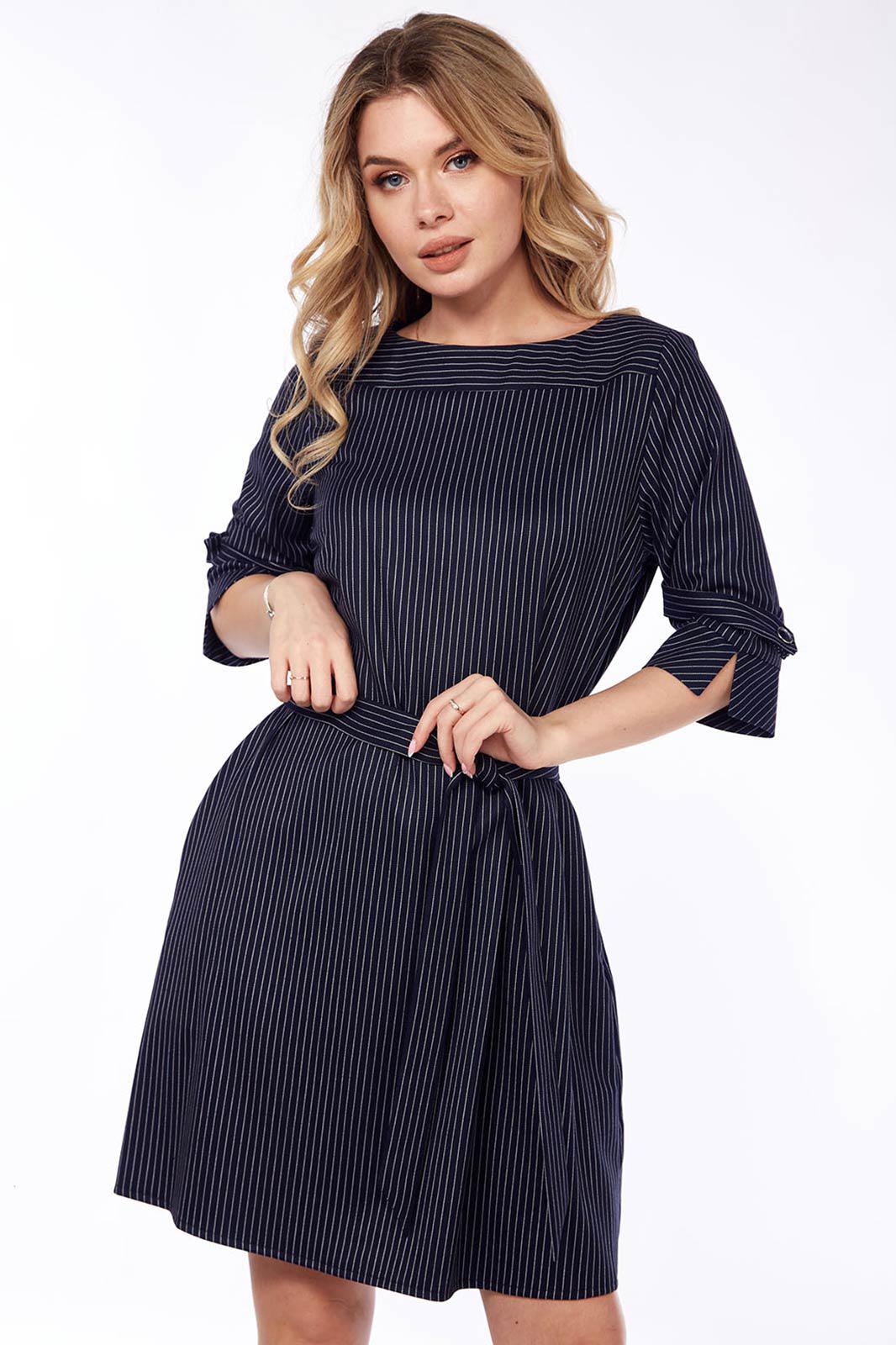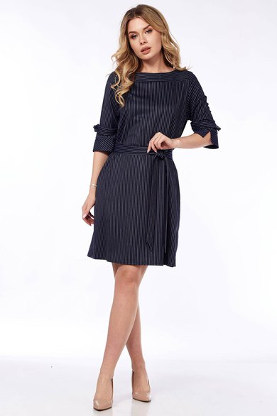 Платье женское из текстильного материала, с круглым вырезом горловины. С кокеткой по переду и слегка расширено книзу. Карманы в боковых швах. Рукава втачные, с отделочной деталью, с разрезом понизу. Комплектуется съемным поясом. Размеры 40-44: длина платья 92 см, длина рукава 37 см.