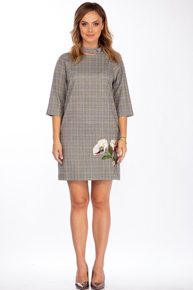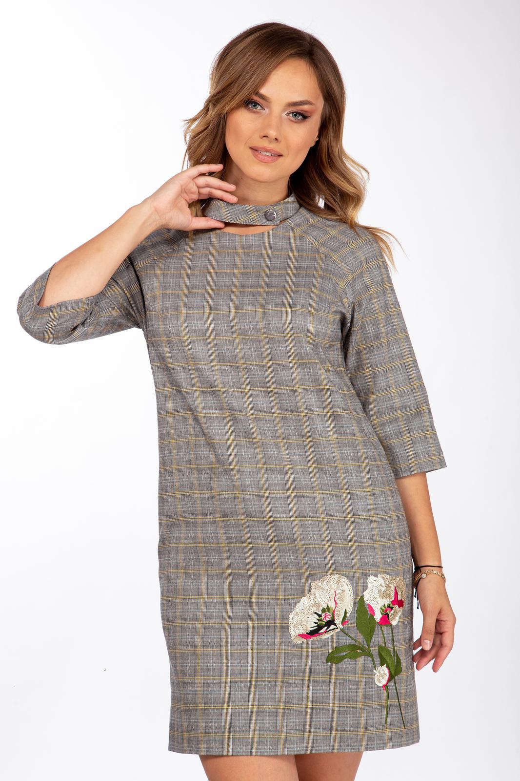 Платье женское, прямого силуэта, из текстильного материала. С круглым вырезом горловины, со съемным воротником - стойкой, застегивающимся на петлю и пуговицу. Рукава реглан длиной 3/4. Перед с нагрудными вытачками и декоративной вышивкой. Спинка со средним швом. Размеры 42-46: длина платья 89 см, длина рукава 38 см.