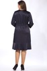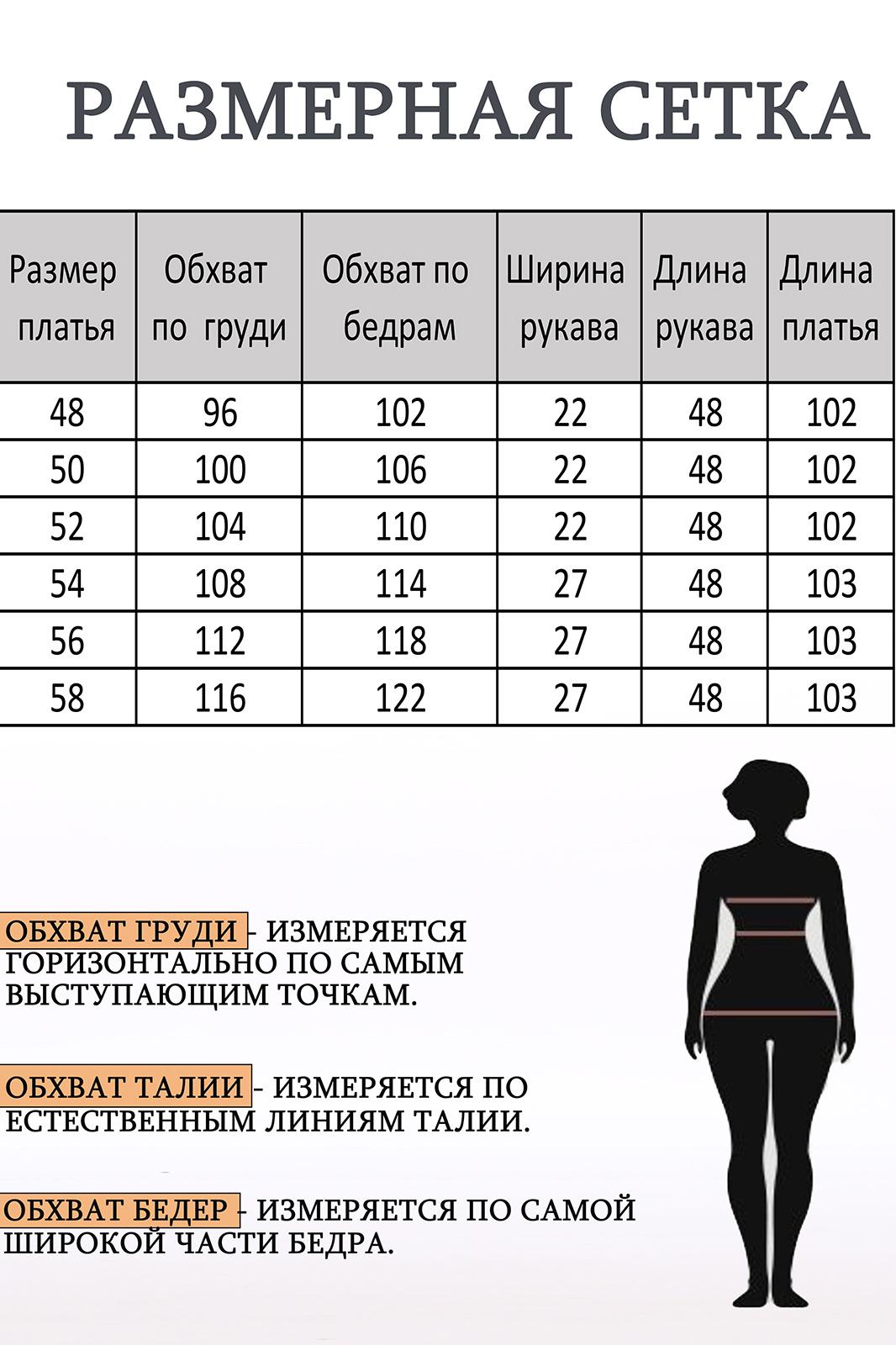 Платье женское, А - силуэта из текстильного материала, с круглым вырезом горловины, нагрудными вытачками, внутренней кулиской по талии с пояском из основного материала. Спинка со средним швом, в верхней части которого обработана застежка на потайную тесьму молнию. Размеры 48-52: длина платья 102 см, длина рукава 22 см. Размеры 54-58: длина платья 103 см, длина рукава 27 см.