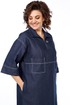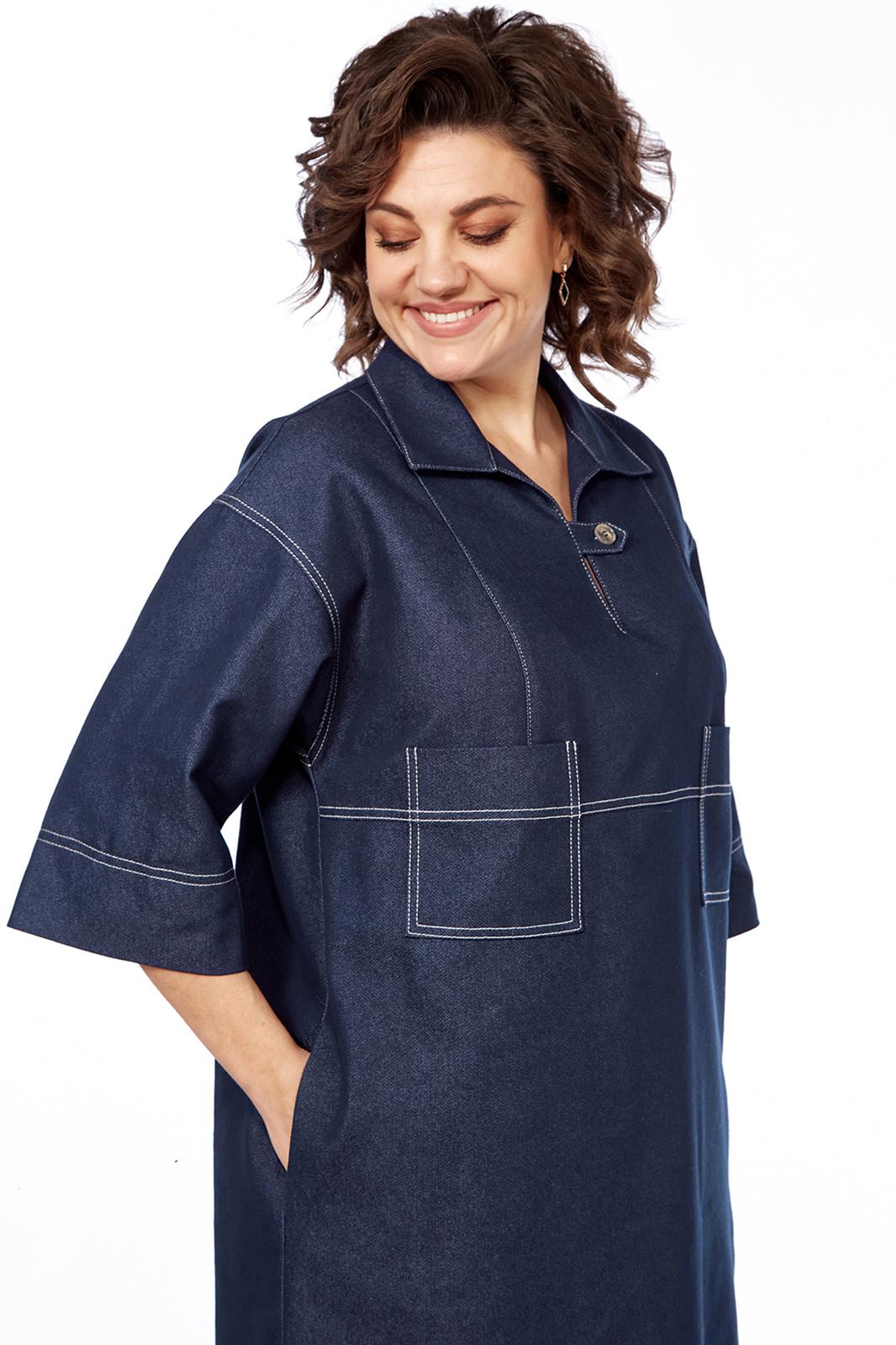 Платье женское, прямого силуэта, из джинсовой ткани. Платье с круглым вырезом горловины, обработанным воротником, со спущенной линией плеча. Перед платья отрезной по линии талии, рельефами и накладными карманами. Спинка цельная. Рукава втачные, одношовные, длиной 3/4. В боковых швах обработаны карманы.