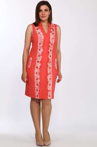 Платье женское, прямого силуэта, с круглым вырезом горловины, обработанным воротником стойкой, без рукавов. Детали переда с рельефами от плечевых швов, с воланами и пришитыми пуговиуами, а также настрочными отделочными деталями фигурной формы с молниями. Платье с отрезными бочками, переходящими на спинку. Центральная застежкка на тесьму - молнию, недоходящая до низа изделия. Спинка с отлетной фигурной кокеткой из отделочного материала, фигурным подрезом, в нижней части которого обработаны разрезы. Размеры 48-50: длина платья 101 см.