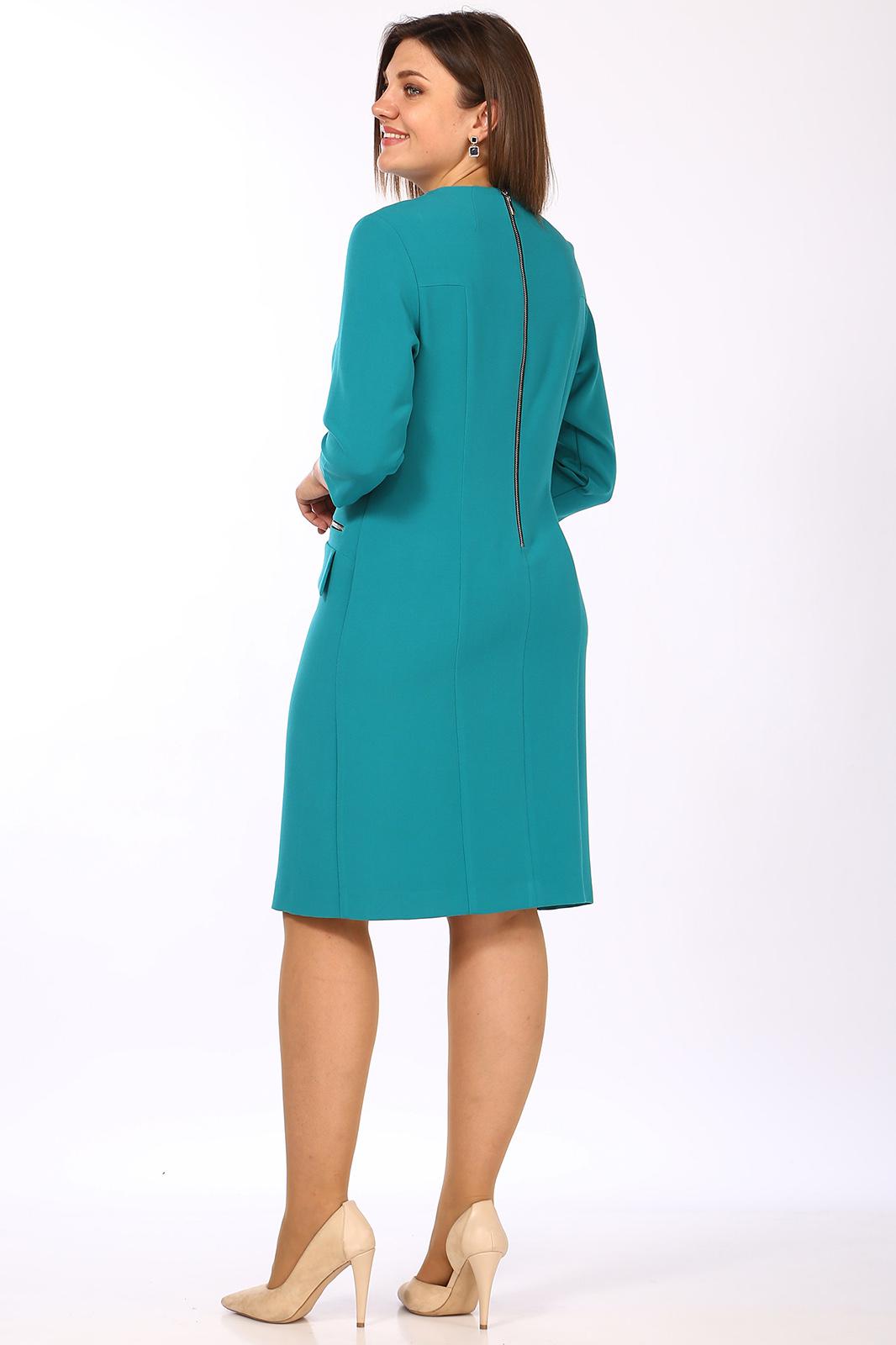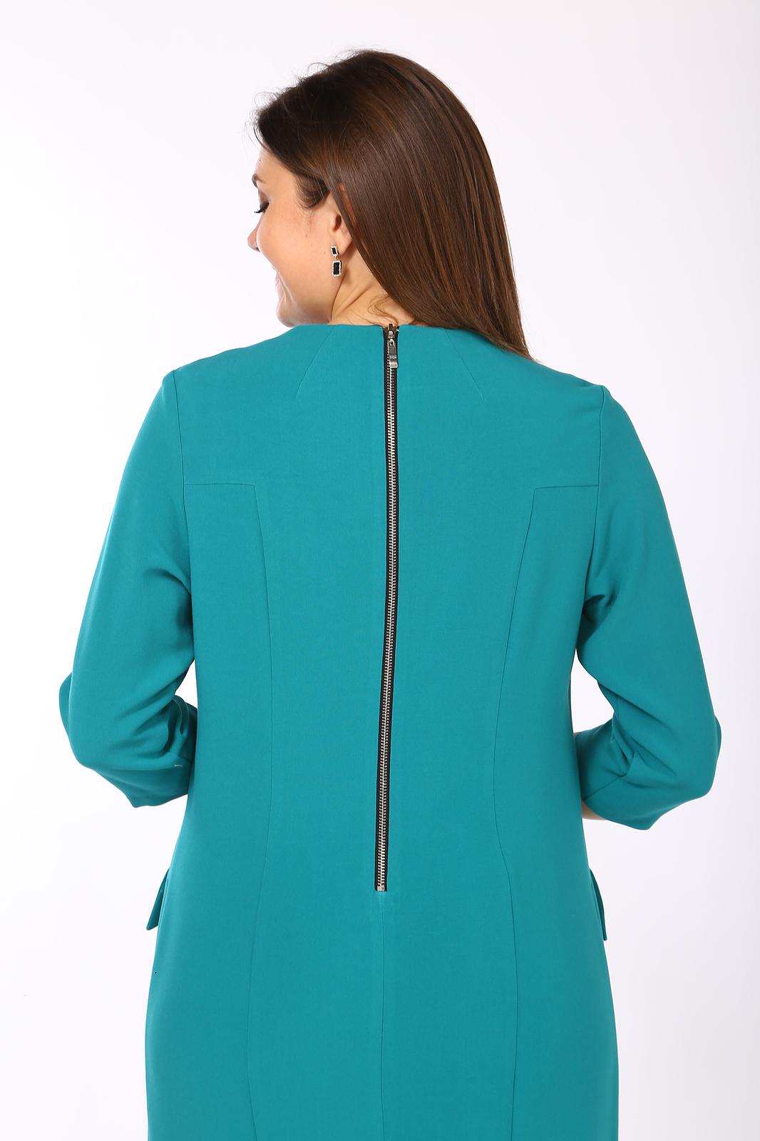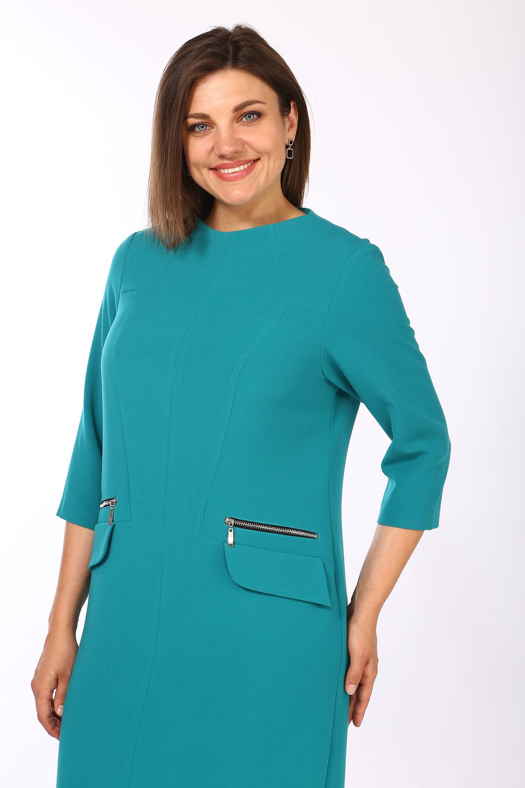 Платье женское, прямого силуэта, текстильное, с круглым вырезом горловины. По переду платья идут 2 кармана, с молнией. Спинка платья обработна застежкой на металлическую молнию. Рукава втачные, одношовные, длиной 3/4. Размеры 40-44: длина платья 90 см, длина рукава 44 см. Размеры 46-50: длина платья 92 см, длина рукава 45 см.