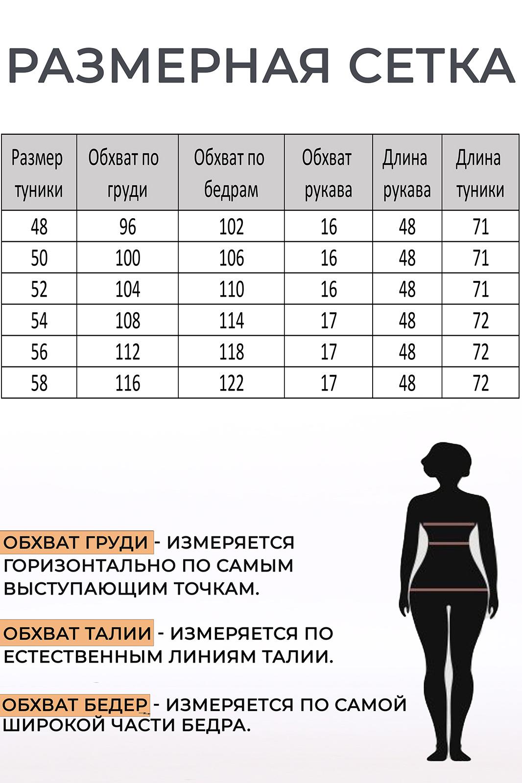 Туника полуприлегающего силуэта с круглым вырезом горловины обработанным притачной бейкой. Перед с планкой по центру и разрезом вверху планки. Рукав цельнокроеный, длиной 3/4. От бейки горловины по центру рукава - втачная деталь, переходящая в фигурный низ. Спинка со средним швом. Низ туники фигурный с притачной бейкой.