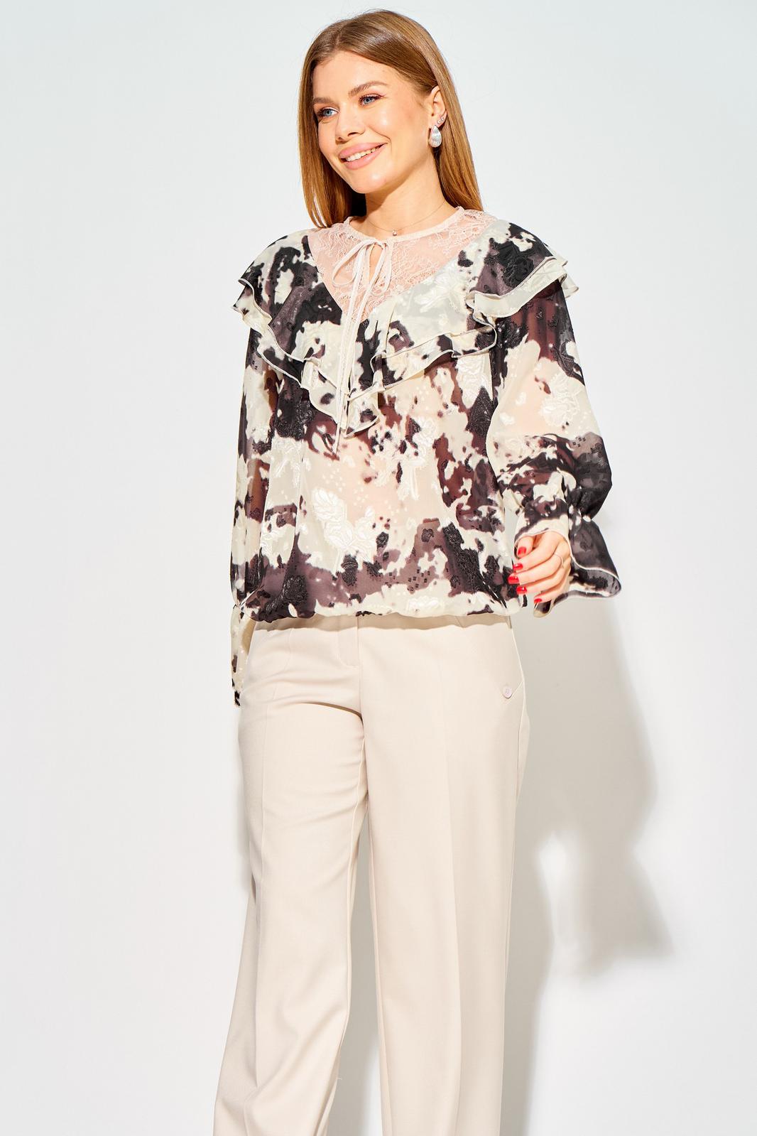 Блуза длиной до линии бедер с центральной застёжкой на декоративную тесьму-молнию. Вырез горловины блузки «под горло», обработан планкой. Деталь переда и спинки с кокеткой из отделочной ткани, в шов вставлены два волана. Деталь переда кокетки со средним швом, с разрезом и по горловине вставлена тесьма-шнур. Рукава втачные одношовные, понизу собраны на эластичную тесьму. В низ блузки вставлена эластичная тесьма.