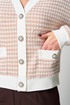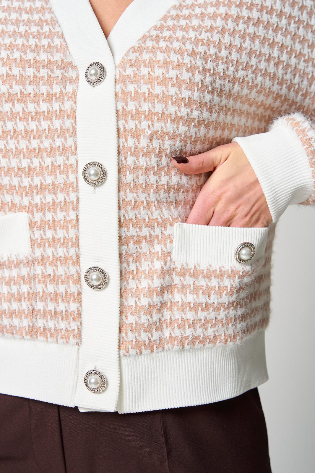 Застежка центральная на петли и пуговицы. На деталях переда накладные карманы с притачными планками, на которые прикреплены декоративные пуговицы. Рукава втачные одношовные длинные, с притачными манжетами. Линия плеча спущена. По низу кардигана, по краю борта и горловине - притачная планка.