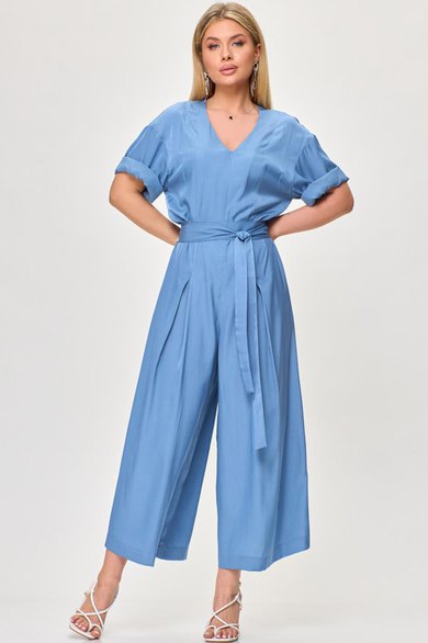 Комбинезон женский, свободного силуэта, со спущенной линией плеча, с втачными рукавами, с застежкой на потайную тесьму-молнию в среднем шве деталей переда, со съемным поясом. Деталь переда комбинезона со средним швом, с рельефными швами, исходящими от плечевых швов, и переходящими в складки. Деталь спинки комбинезона со средним швом, с талиевыми вытачками. Рукава втачные одношовные, широкие, короткие. В боковых швах обработаны карманы. Вырез горловины комбинезона «V-образной» формы, обработан обтачкой.