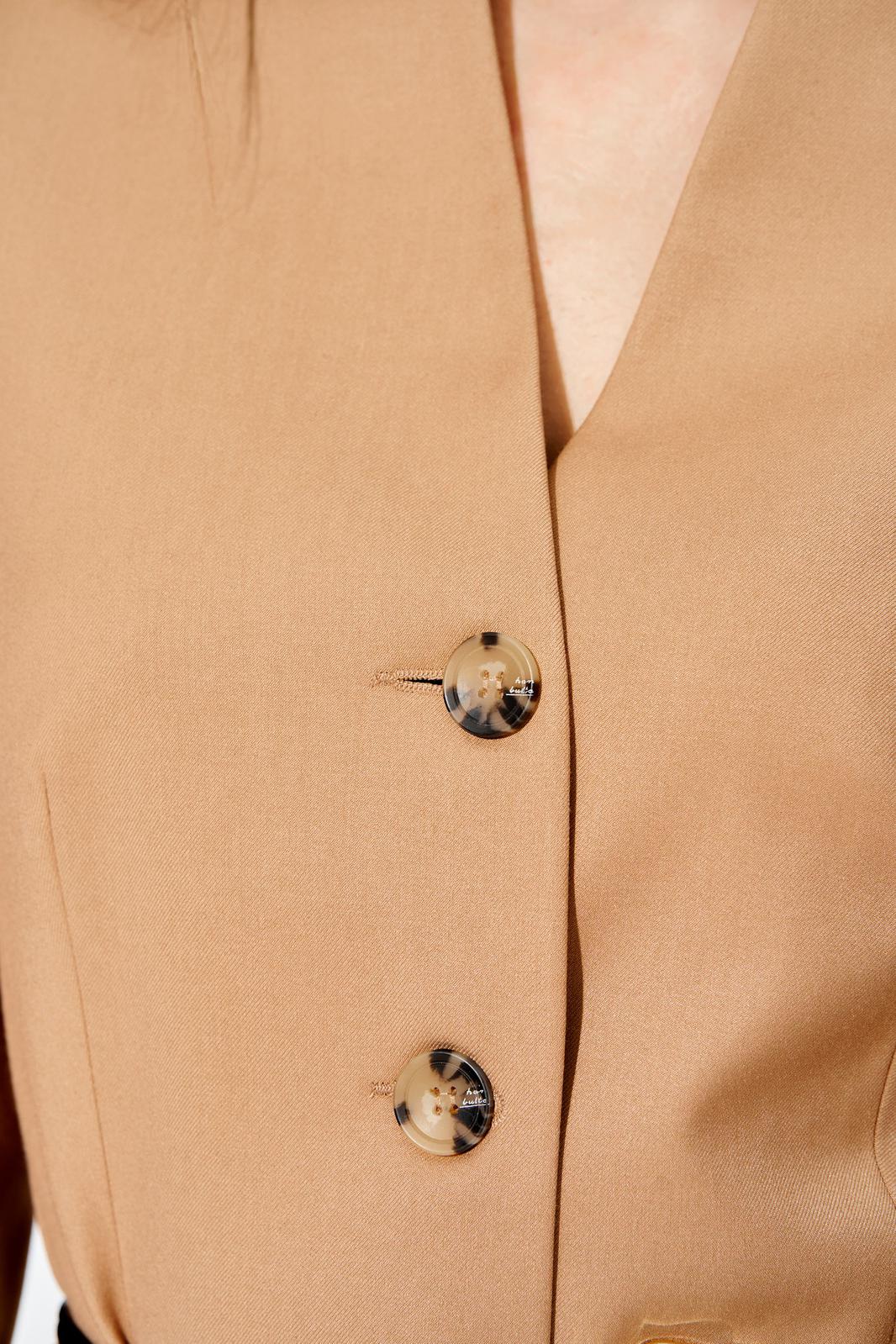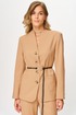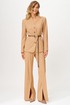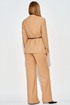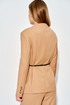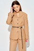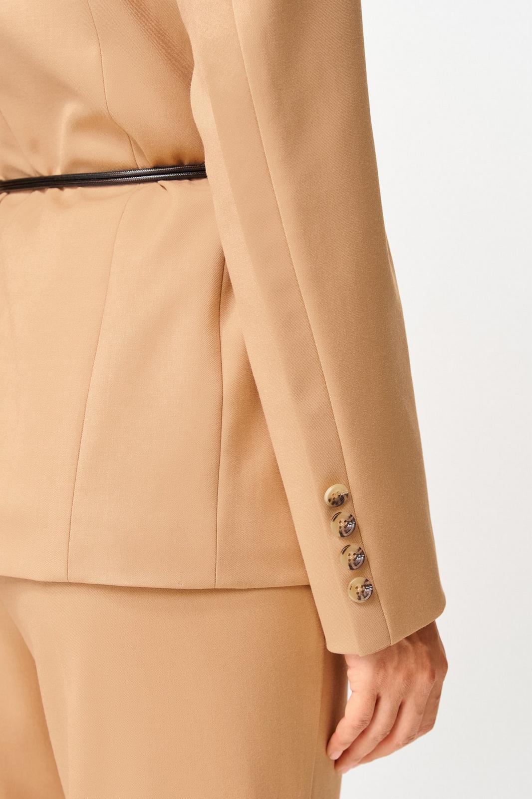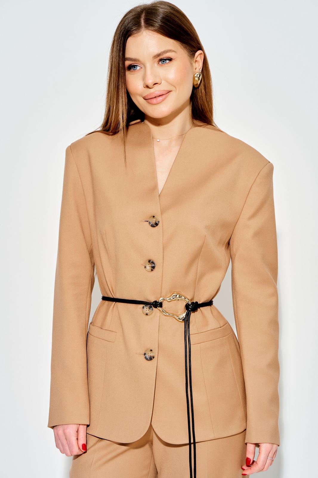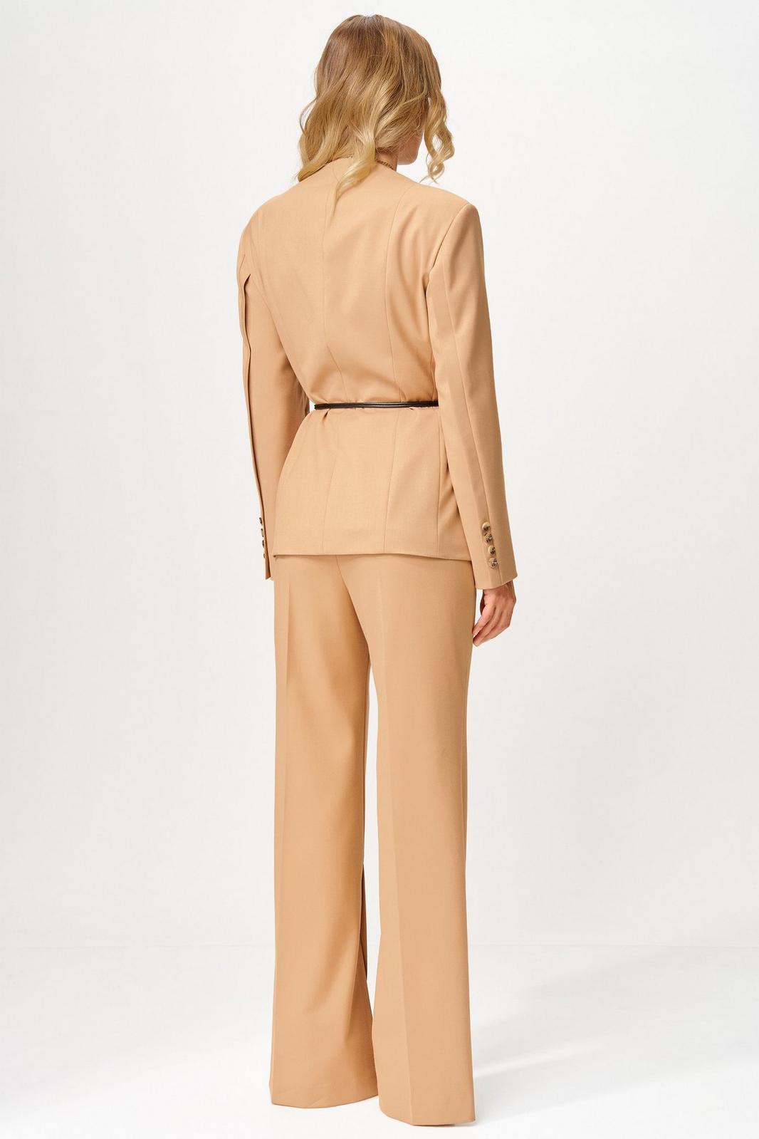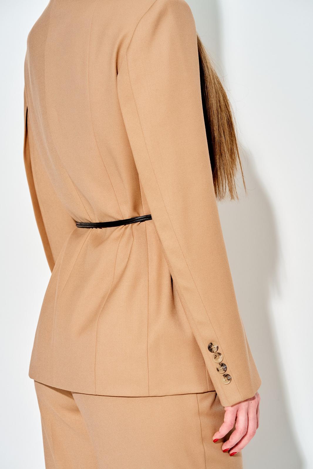 Жакет полуприлегающего силуэта с центральной застежкой на 4 петли и 4 пуговицы. Вырез горловины жакета фигурной формы. Детали переда жакета с отрезными бочками и вертикальными нагрудными вытачками. Карманы горизонтальные прорезные с листочками с втачными концами. Деталь спинки жакета со средним швом, отрезными бочками и рельефными швами. Рукава втачные двухшовные, по локтевым швам вставлена планка, по низу декоративно прикреплены по 4 пуговицы. Жакет с притачной понизу подкладкой. Съемный пояс в комплекте.