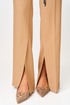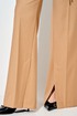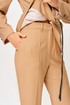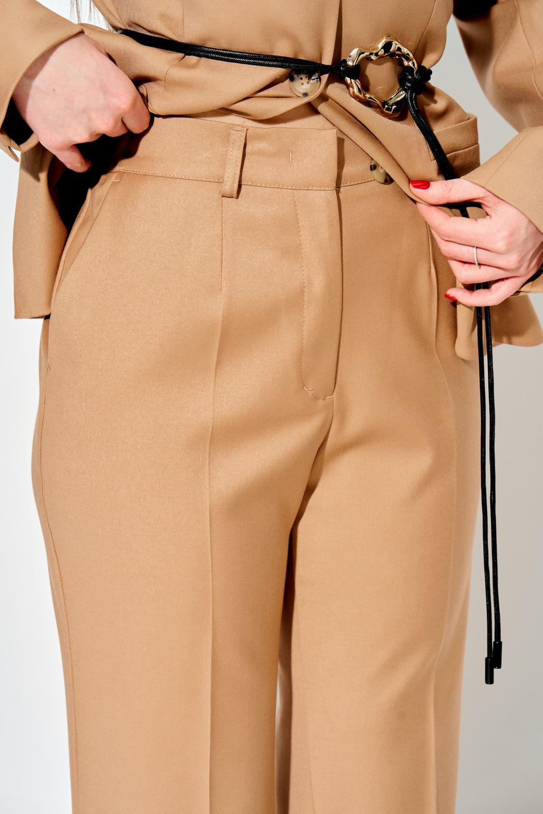 Брюки на бедрах, плотно облегающие вверху и расширенные к низу. Пояс притачной, по спинке пояса вставлена эластичная тесьма. Застежка на тесьму-молнию, 1 потайной крючок и 1 потайную петлю и пуговицу. В боковых швах обработаны наклонные карманы, на передних и задних половинках брюк обработаны вытачки и заутюжены «канты». Внизу шаговых швов обработаны шлицы. На поясе прикреплены 5 шлёвок.