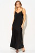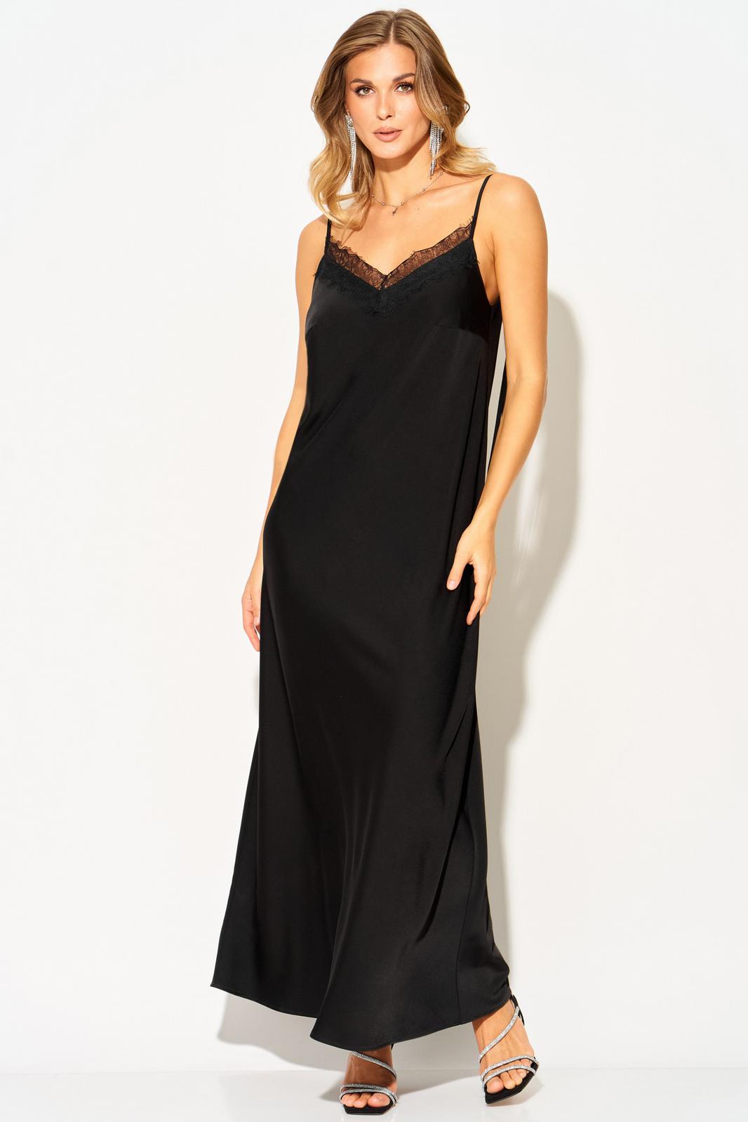 Платье полуприлегающего силуэта, длиной «в пол», на бретелях, с «V-образным» вырезом горловины спинки и переда. Деталь переда платья с нагрудными вытачками, горловина оформлена декоративным кружевом.
