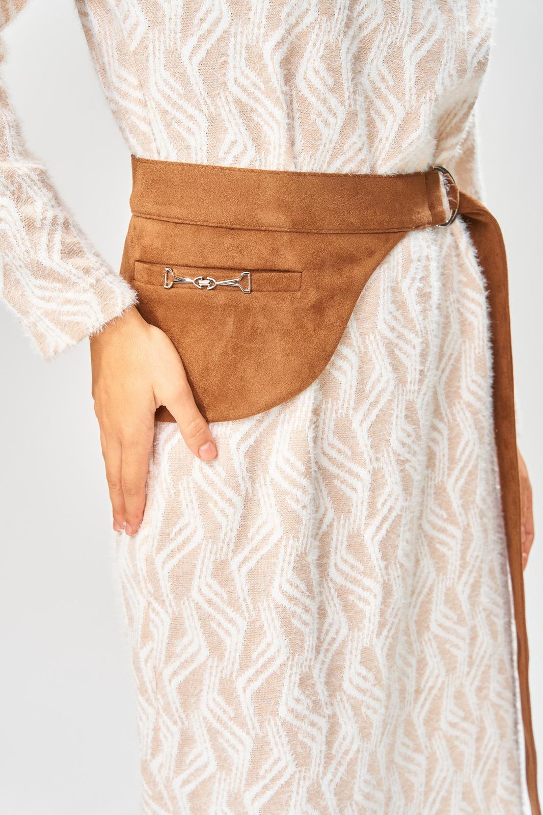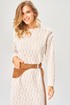 Вырез горловины округлой формы с втачной бейкой. Перед и спинка цельные. Рукава втачные одношовные длинные, линия плеча спущена. В левом боковом шве обработан разрез. В комплекте съемный пояс с застежкой на пряжку. На съемном поясе обработан карман с листочкой с втачными концами.