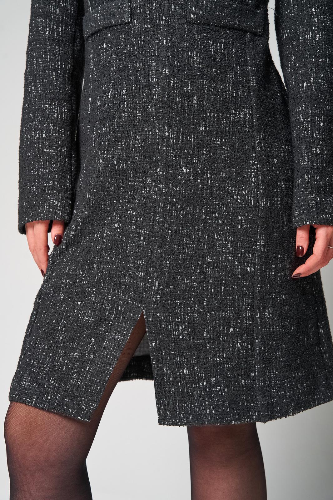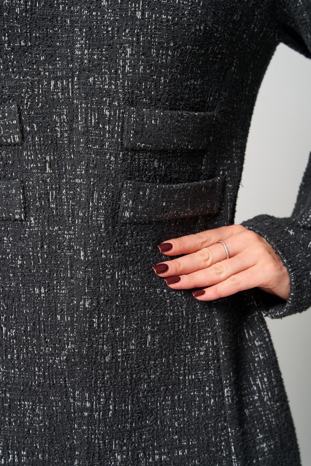 Детали переда платья с рельефными швами, исходящими от пройм до низа, со средним швом, который заканчивается разрезом V-образной формы сверху. На уровне линии талии настрочены по 2 листочки с каждой стороны. Спинка платья со средним швом. Рукава втачные двухшовные длинные.