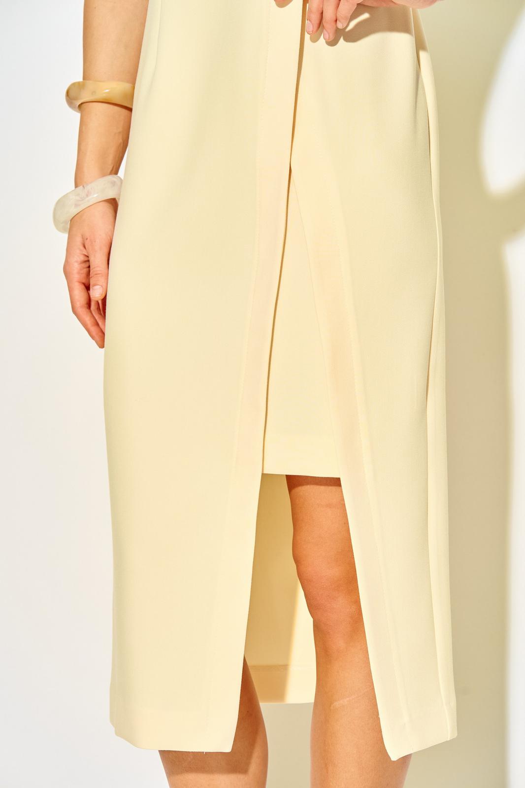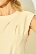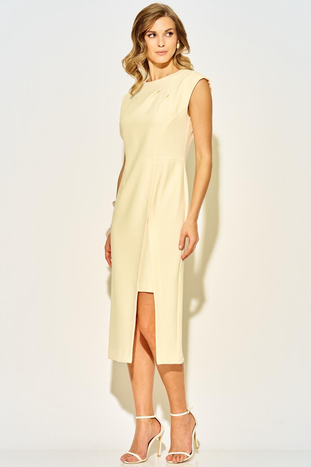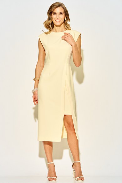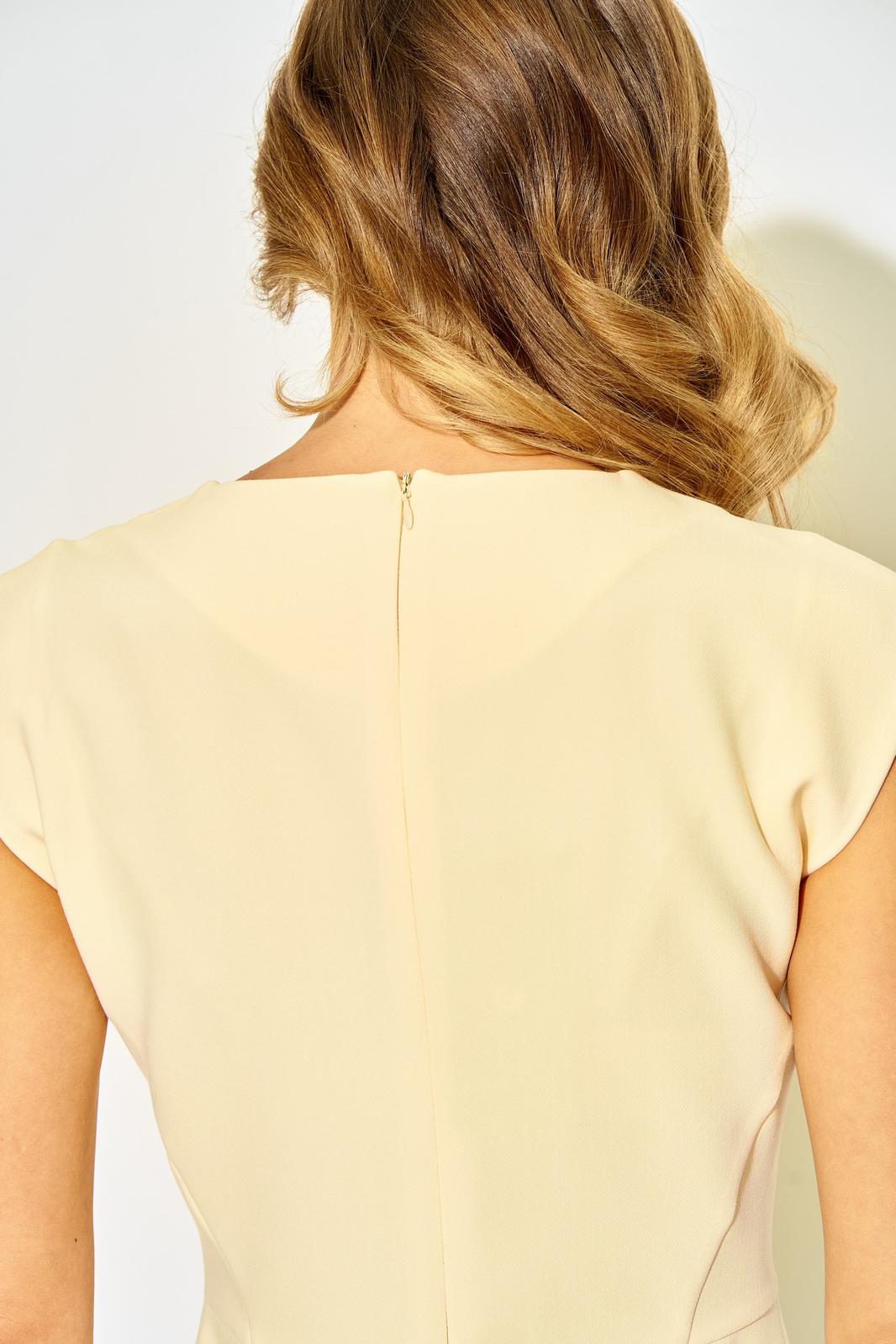 Вырез горловины платья округлой формы. Деталь переда с полурельефами, на уровне линии талии в боковых частях горизонтальные подрезы. Левый рельефный шов заканчивается фигурным разрезом со вставкой. На левом плече обработаны 2 складки. Спинка платья со средним швом и с полурельефами, на уровне линии талии в боковых частях горизонтальные подрезы. В среднем шве спинки с застежка на потайную тесьму-молнию.