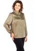 Блузка прямого силуэта, выполнена из ткани типа тонкого атласа с жаккардовым рисунком. Воротник на стойке, застежка на пуговицы, по боковым швам разрезы. Рукав длинный, расширенный, сверху небольшая сборка, внизу тоже сборка + притачная манжета с пуговицей.