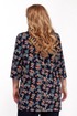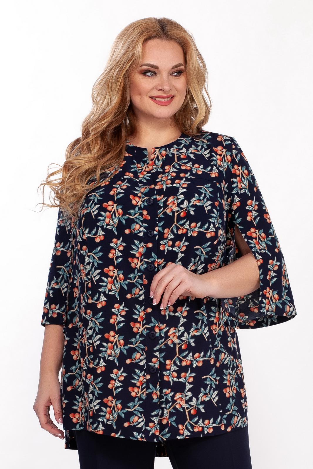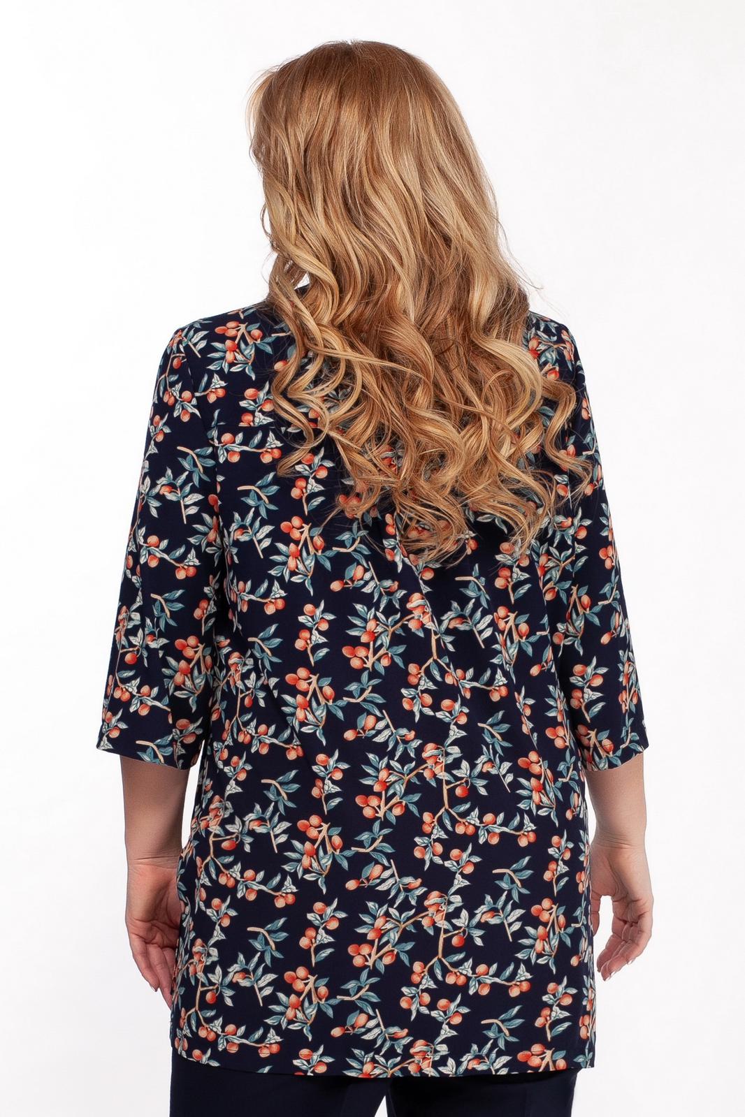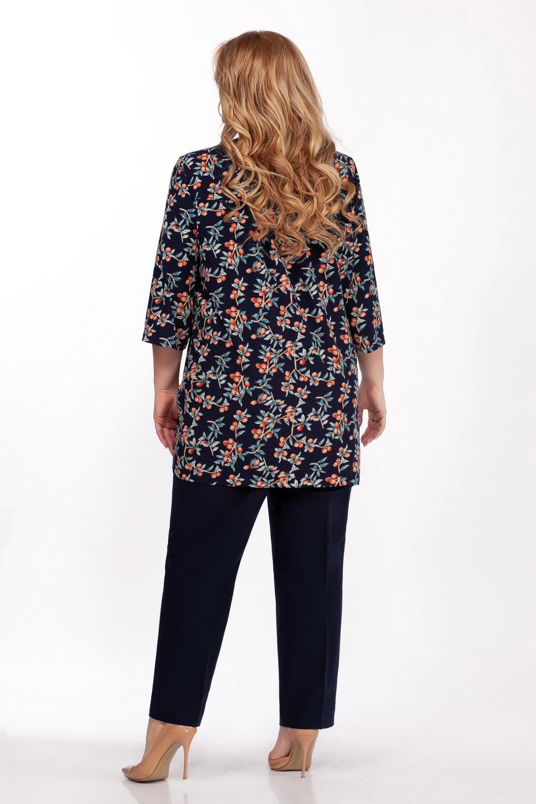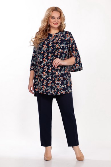 Костюм двухпредметный: туника, брюки. Туника полуприлегающего силуэта, выполнена из легкой шелковистой ткани с вискозой с ягодным принтом. Фигурный вырез горловины оформлен планкой, застежка по планке на пуговицы. По боковым швам разрезы. Спинка ниже переда, рукав чуть ниже локтя с разрезом по внутреннему шву. Брюки классического кроя слегка заужены, на поясе по бокам вставлены резинки. Длина туники по спинке 87 см, длина рукава 47 см. Состав ткани туники: 50% вискоза, 45% полиэстер, 5% спандекс. Длина брюк по боковому шву 107 см. Состав ткани брюк : полиэстер 71%, 23% вискоза, 6% спандекс.