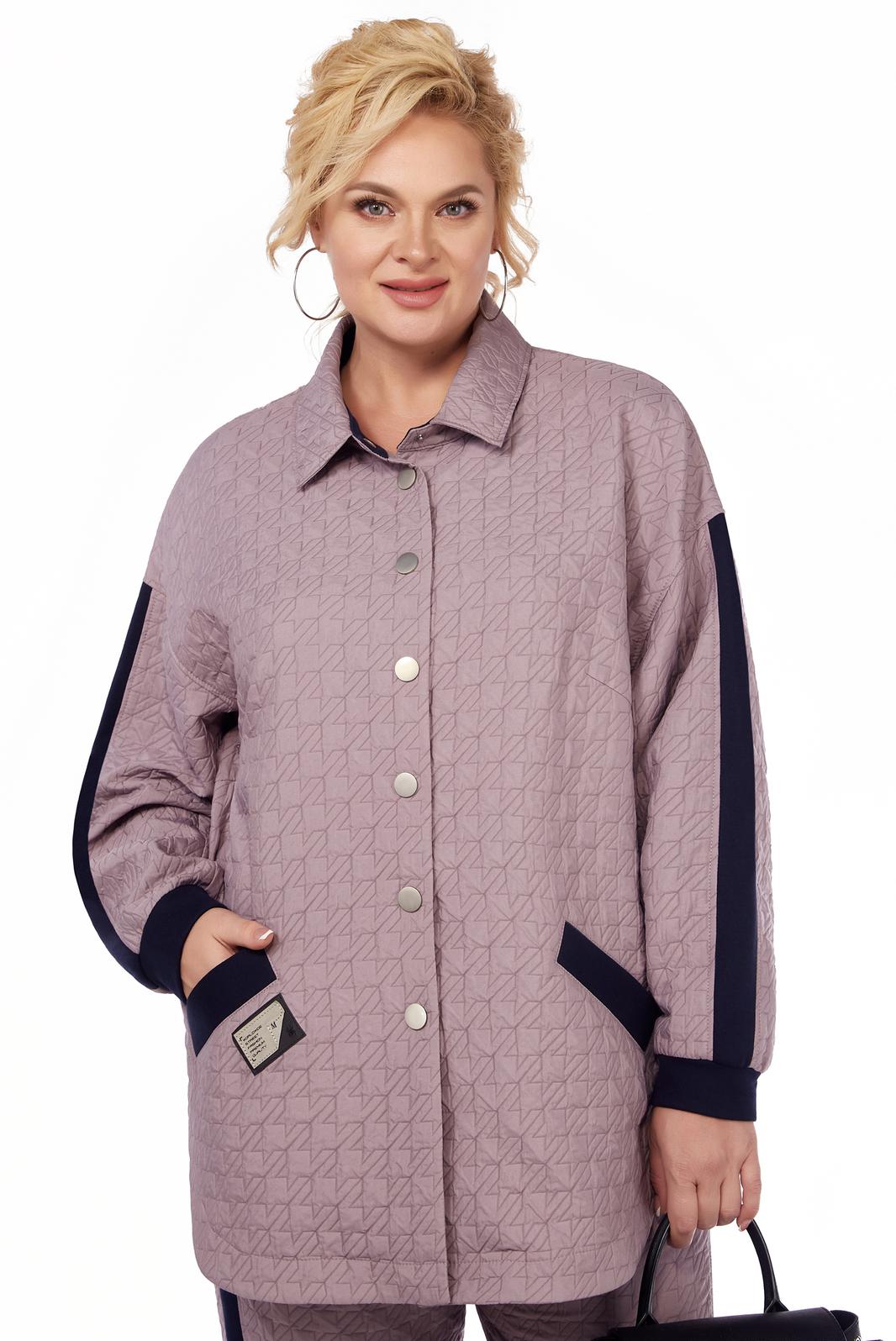 Выполнен комплект из простеганной ткани (без синтепона) + отделка из трикотажа. Свободная куртка средней длины в виде рубашки: воротник на стойке (изнутри трикотаж), закругленные края к боковым швам. Впереди застежка на кнопки, нагрудные вытачки, внутренние карманы наискосок с широкими листочками из трикотажа + декор (нашивка). По спинке кокетка и вставка по центральному шву. Линия плеча приспущена, рукав длинный, на трикотажной манжете. Брюки длинные с лампасами и внутренними карманами у боковых швов. Брюки оформлены трикотажным притачным поясом на резинке, внизу – лампасы из трикотажа.