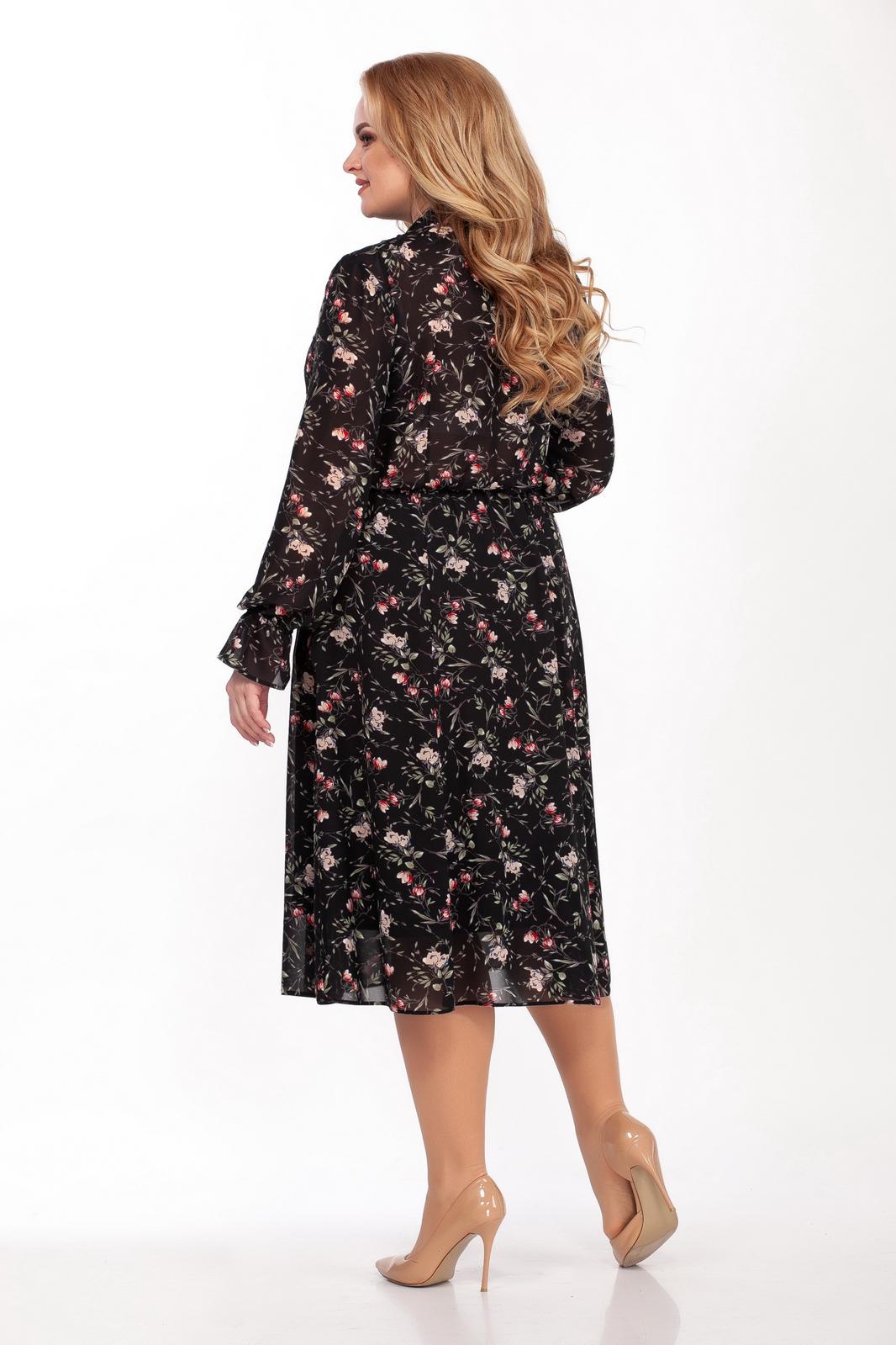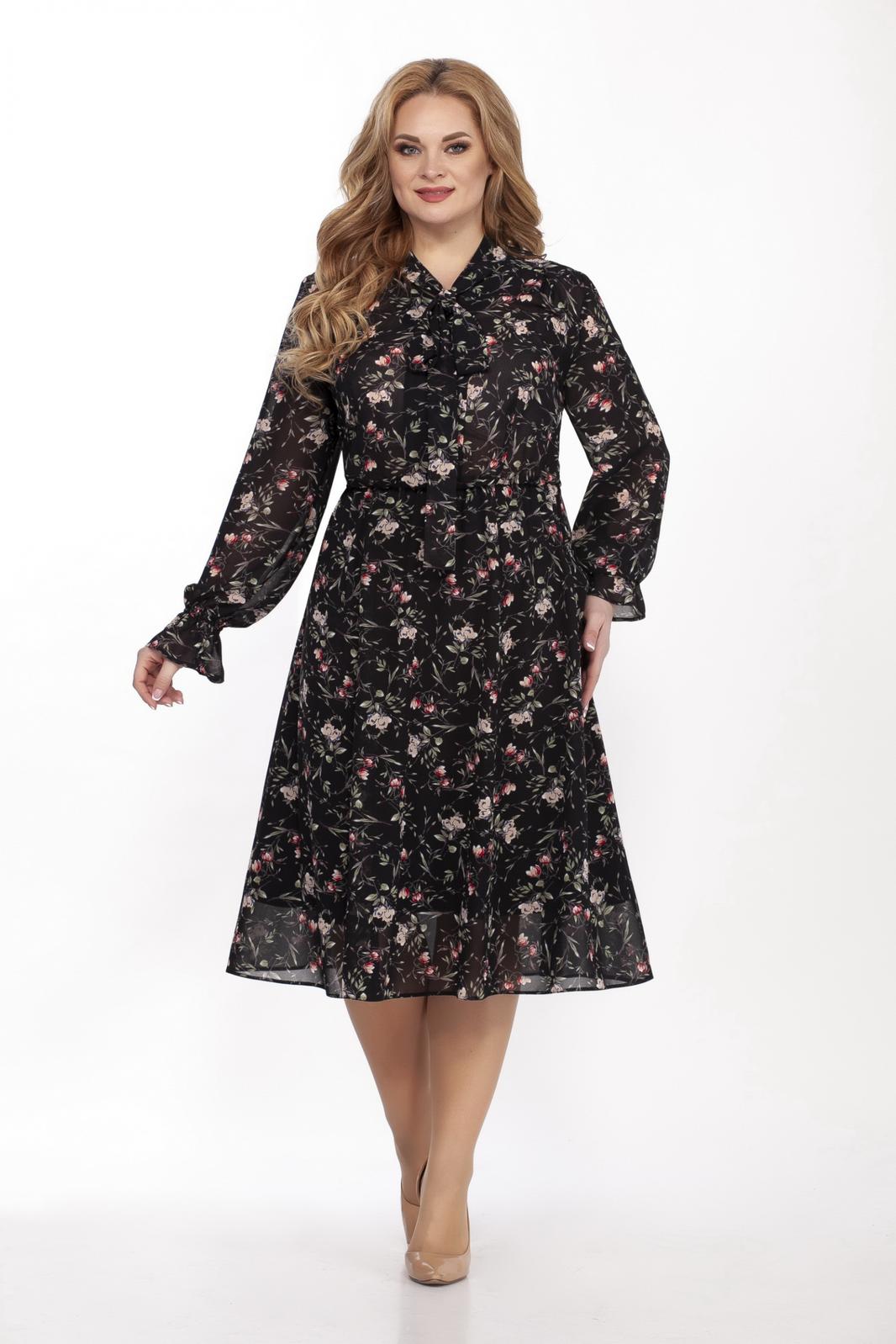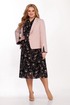 Комплект двухпредметный: платье и жакет. Модное сочетание шифонового легкого платья с жакетом из костюмной ткани. Платье-миди полуприлегающего силуэта, выполнено из шифона, воротник-стойка переходит в бант, застежка на пуговицы, по линии талии - подрез с резиночкой. В верхней части кокетка со складочками, по спинке-вытачки, нижняя часть платья из 6 клиньев. Нижняя часть платья на легкой шелковистой подкладке, благодаря чему платье не просвечивается. Рукав длинный, внизу - резиночка. Жакет слегка укороченный, с отложным воротником и лацканами, застежка на одну пуговицу. Впереди подрез по линии талии, в верхней части-кокетки и рельефы, в нижней - накладные карманы. По спинке кокетка, рельефы, подрез по талии. Рукав длинный , с высокой расширенной манжетой, на манжете разрез с лейбой. Жакет на подкладке. Линии деталей подчеркнуты двойными строчками. Состав жакета: 65% вискозы, 35% полиэстер. Состав платья: 55% вискоза, 45% полиэстер. Длина платья сзади по спинке от плечевого шва 121см, длина рукава платья 65см. Длина жакета сзади по спинке от плечевого шва 59см, длина рукава жакета 63см.