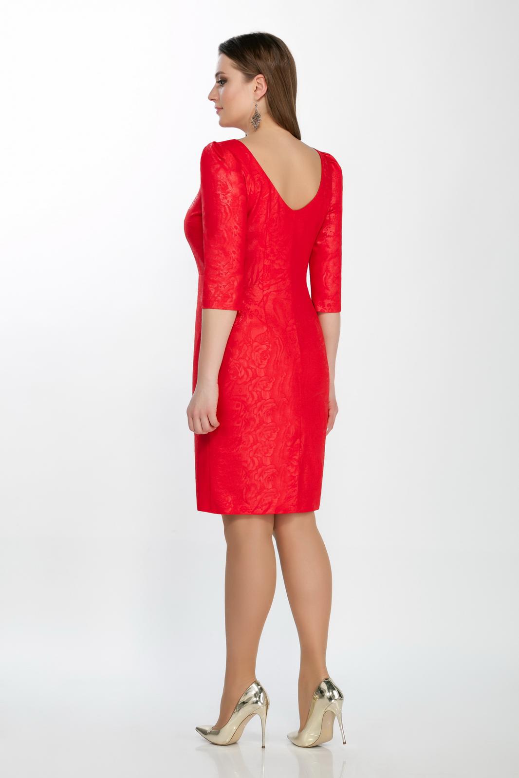 Платье выполнено из фактурного трикотажа-жакарда с эффектной драпировкой.