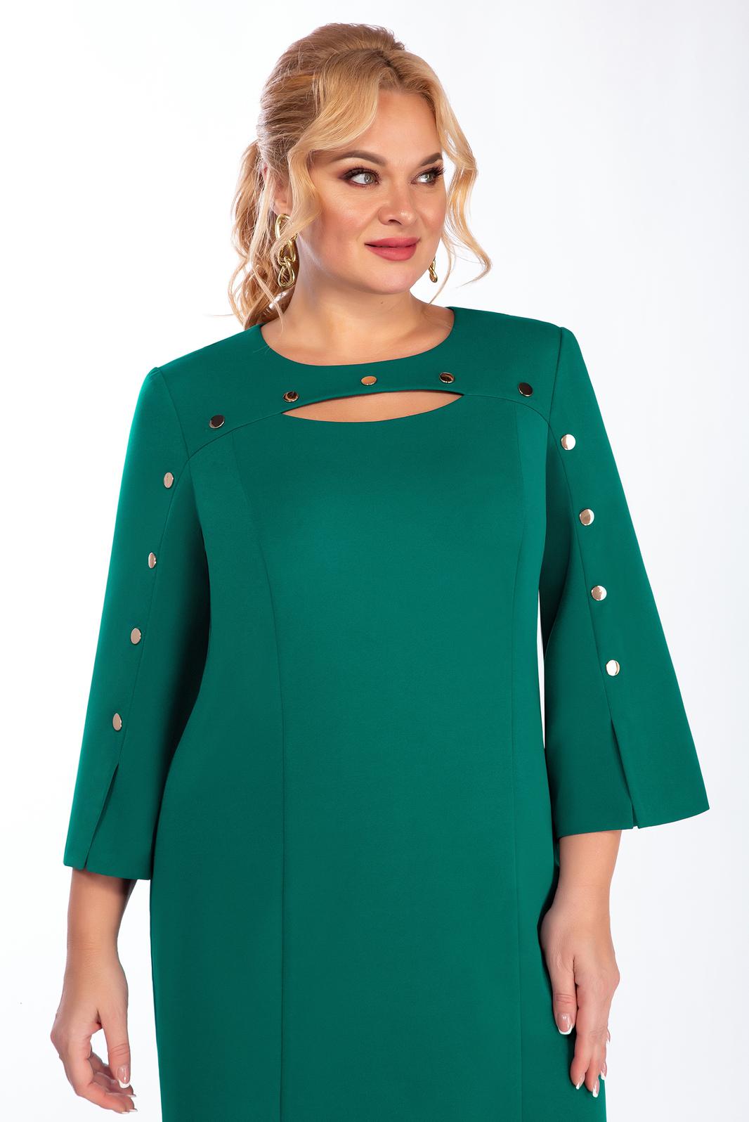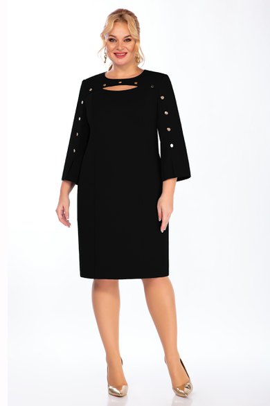 Платье полуприлегающего силуэта на подкладке средней длины. Впереди кокетка, под ней продолговатый кокетливый вырез и вертикальные рельефы. Платье выполнено из плотной ткани и в тоже время шелковистой и пластичной. По спинке центральный шов, застежка «молния» и вертикальные рельефы. Рукав 7/8, по внутреннем шву шлица. Кокетка и рукава продекорированы золотой металлической фурнитурой. Состав ткани: 95% полиэстер 5% спандекс. Длина платья 100 см. длина рукава платья 51см