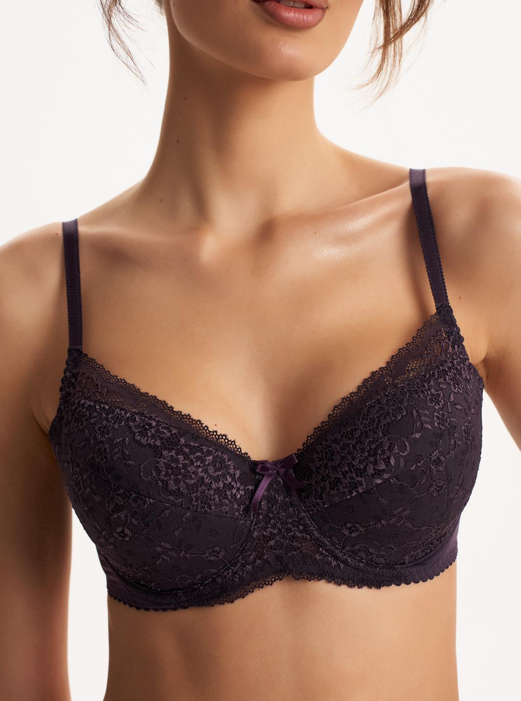 Бюстгальтер из эластичного кружева и эластичного трикотажного полотна на среднюю размерную группу. Чашка выполнена из дубляжа, присутствуют каркасы («косточки»).