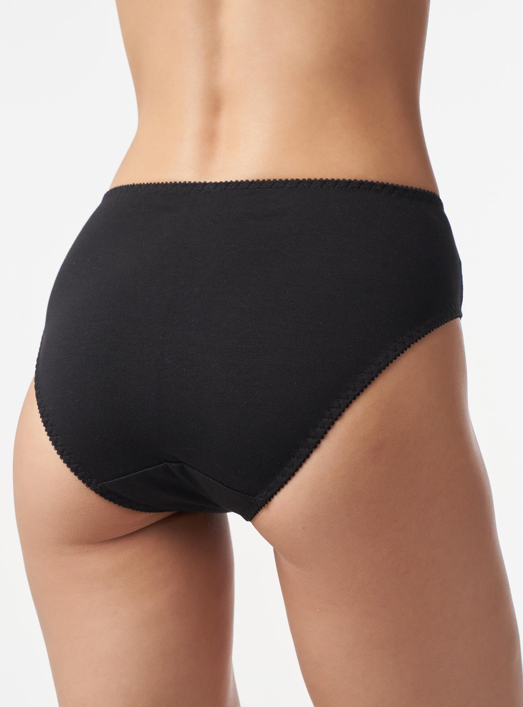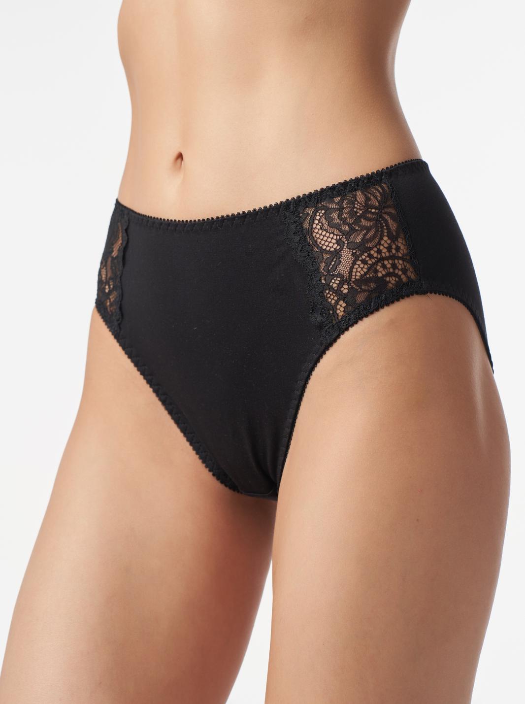 Полноразмерные трусы слипы с высокой линией талии (закрывают пупок), выполненные из хлопка и декорированные вставками из кружева по бокам. Подкладка ластовицы из 100% х/б.100% х/б.