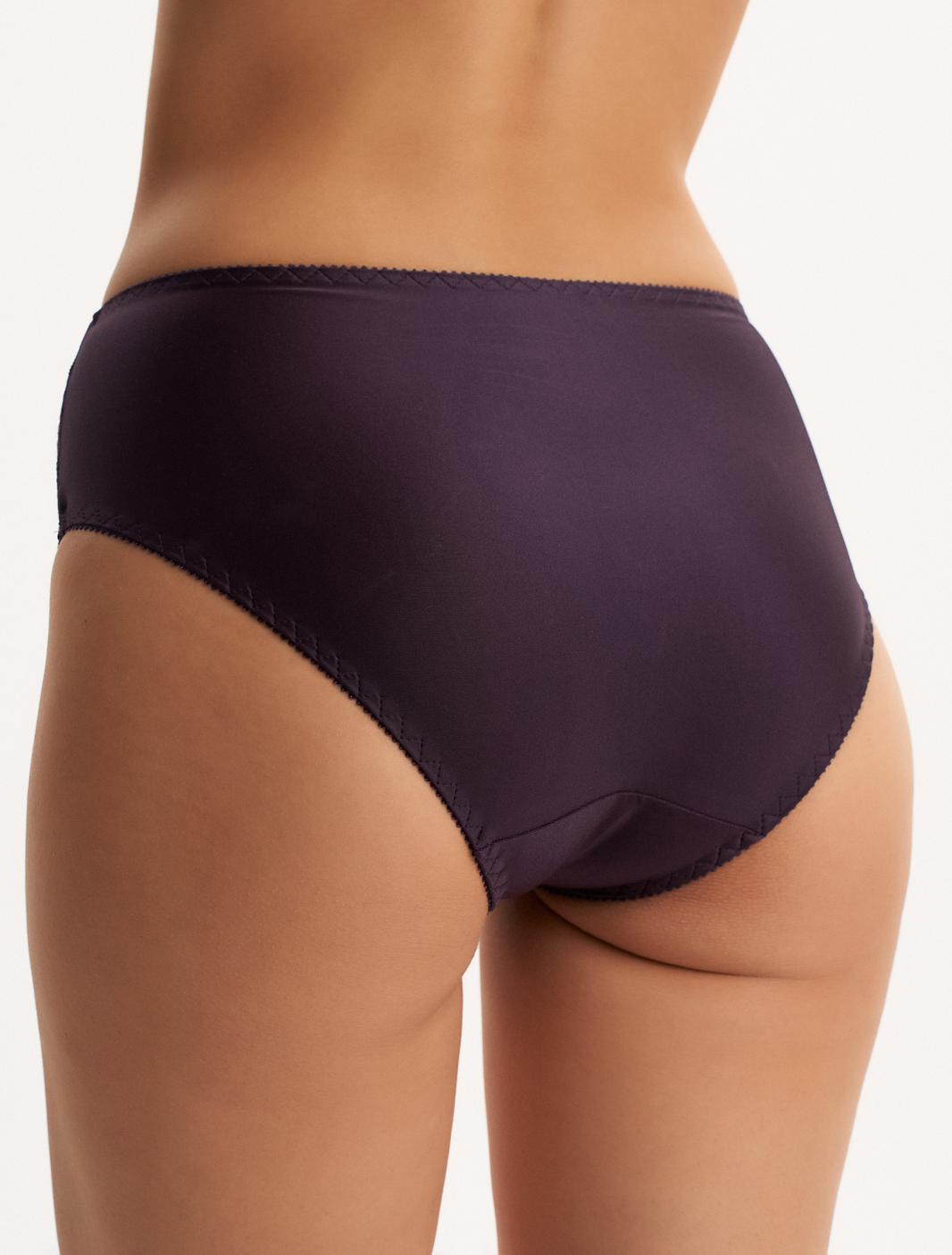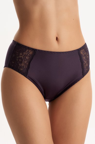 Полноразмерные трусы слипы с высокой линией талии (закрывают пупок), выполненные из эластичного трикотажного полотна (микрофибра) и декорированные вставками из кружева по бокам. Подкладка ластовицы из 100% х/б.